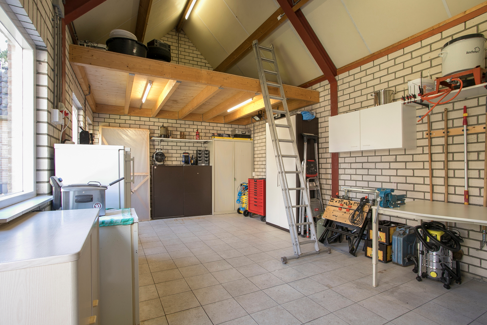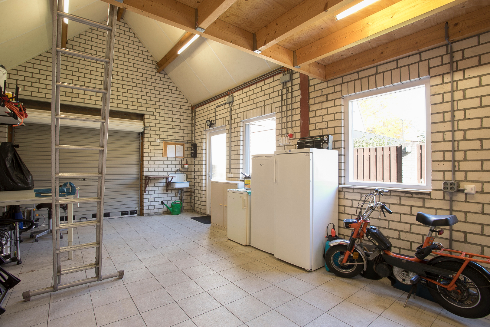 De vrijstaande garage is in spouw gezet en ruim van opzet met tegelvloer, roldeur en twee loopdeuren. Aparte stoppenkast met krachtstroom is aanwezig, fonteintje en een royale bergzolder.