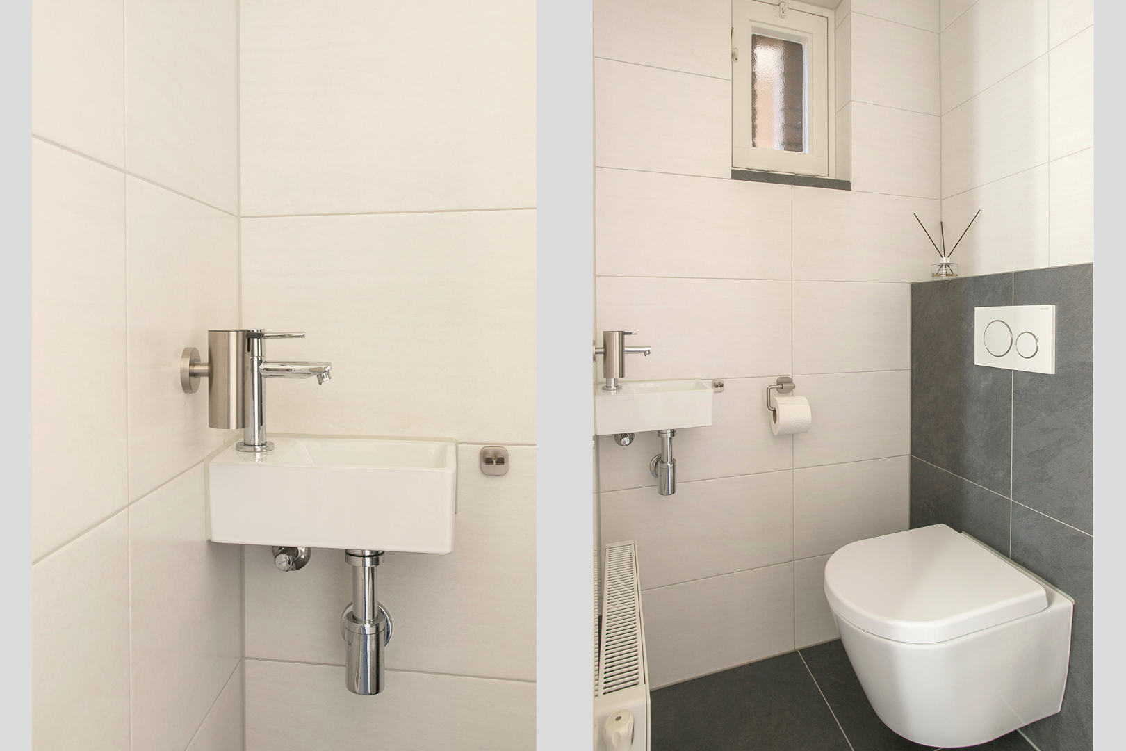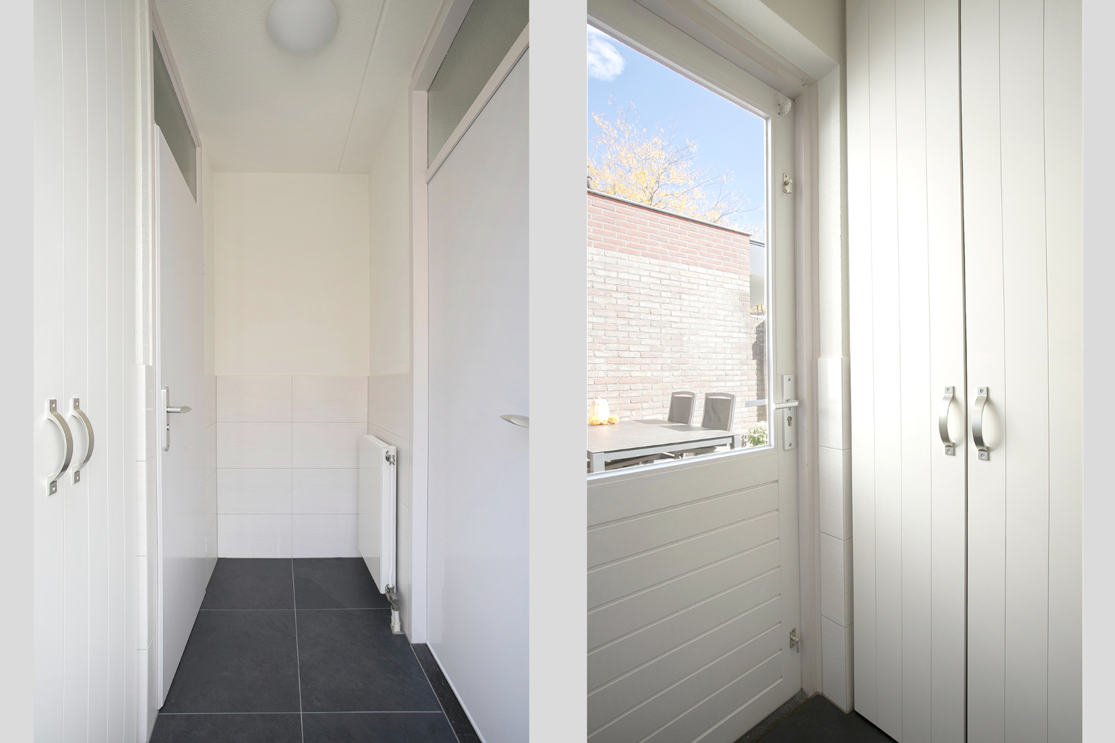 Vanuit de keuken kom je in een portaal met tegelvloer en toegang tot een betegeld toilet met hangcloset en een designfonteintje.