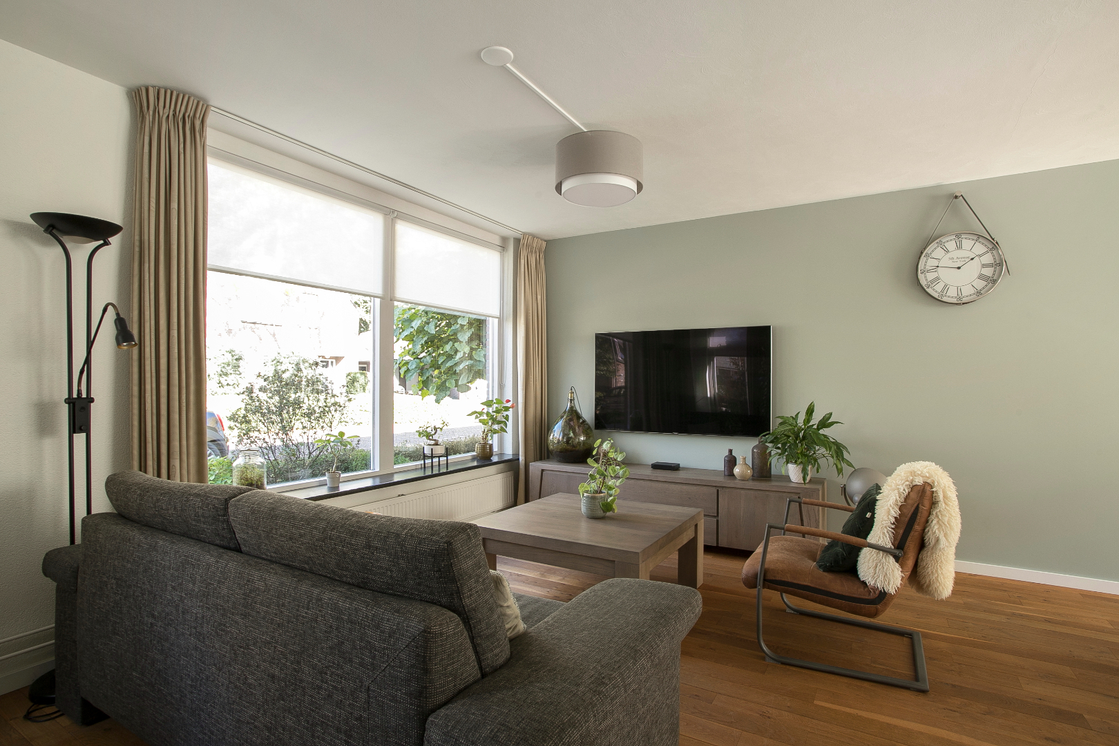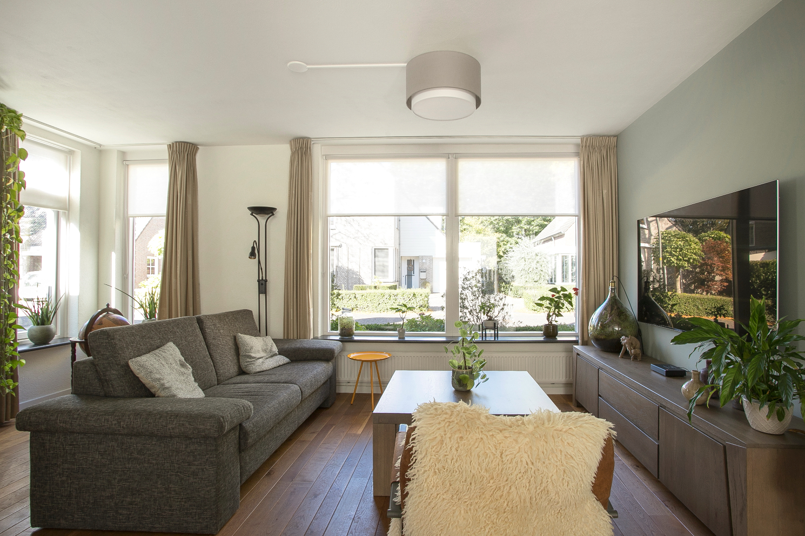 Lichte L-vormige woonkamer met massief houten vloer, stucwerk plafond en openslaande raam. Gedeeltelijk gestukte wanden en gedeeltelijk spachtelputz.