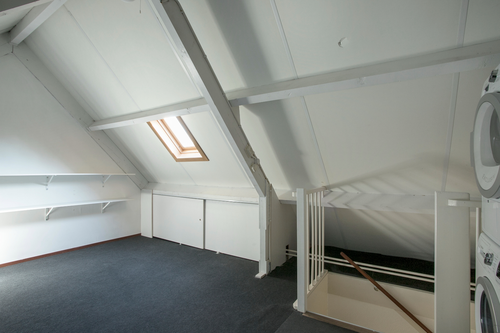 Met vaste trap naar de verdieping met een betonnen vloer voorzien van vloerbedekking. Aansluitingen voor wasmachine en droger. Opstelling van de Cv installatie ( Nefit) b.j. 2006. Het dak is voorzien van isolatie. Aan de zijkanten onder de dakschuinten zijn ruimten voor opslag. Dakraam (isolerend glas). De nokhoogte is voldoende om de ruimte voor verschillende doeleinden te kunnen gebruiken.