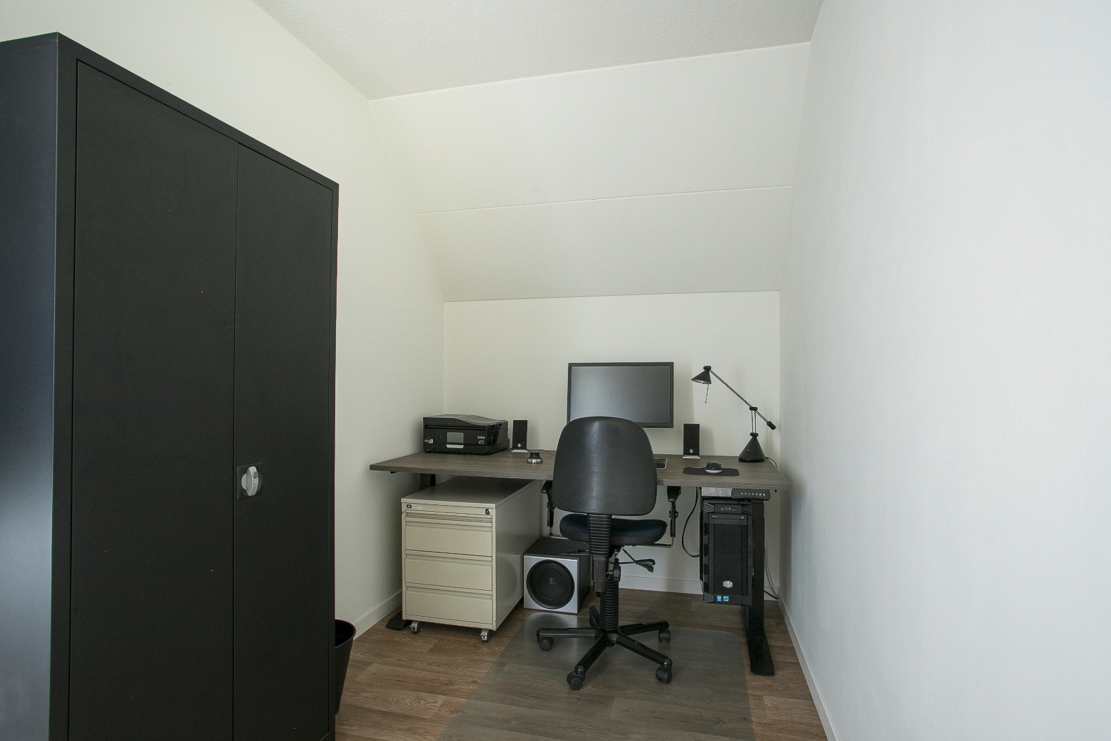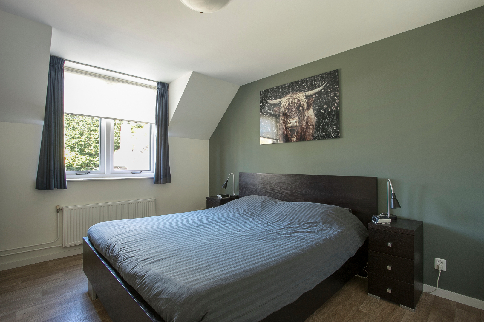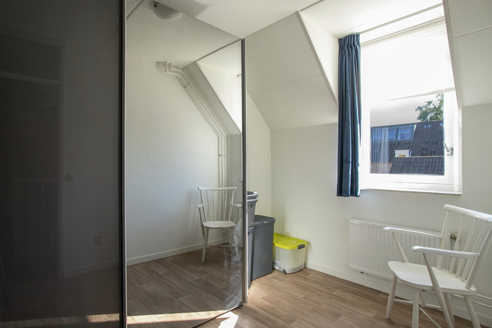 De derde slaapkamer ligt aan de achterzijde en heeft in de openslaande raam een hor en ook een vloer van vinyl.