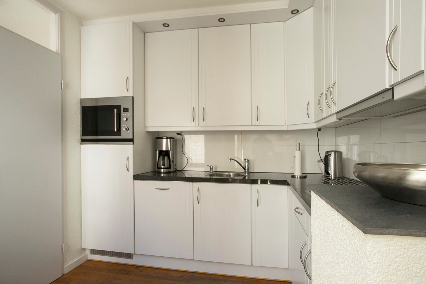Granieten werkblad, elektrisch (keramisch) koken, carrouselkast, veel bovenkastjes, Siemens vaatwasser, combimagnetron en een grote koelkast.