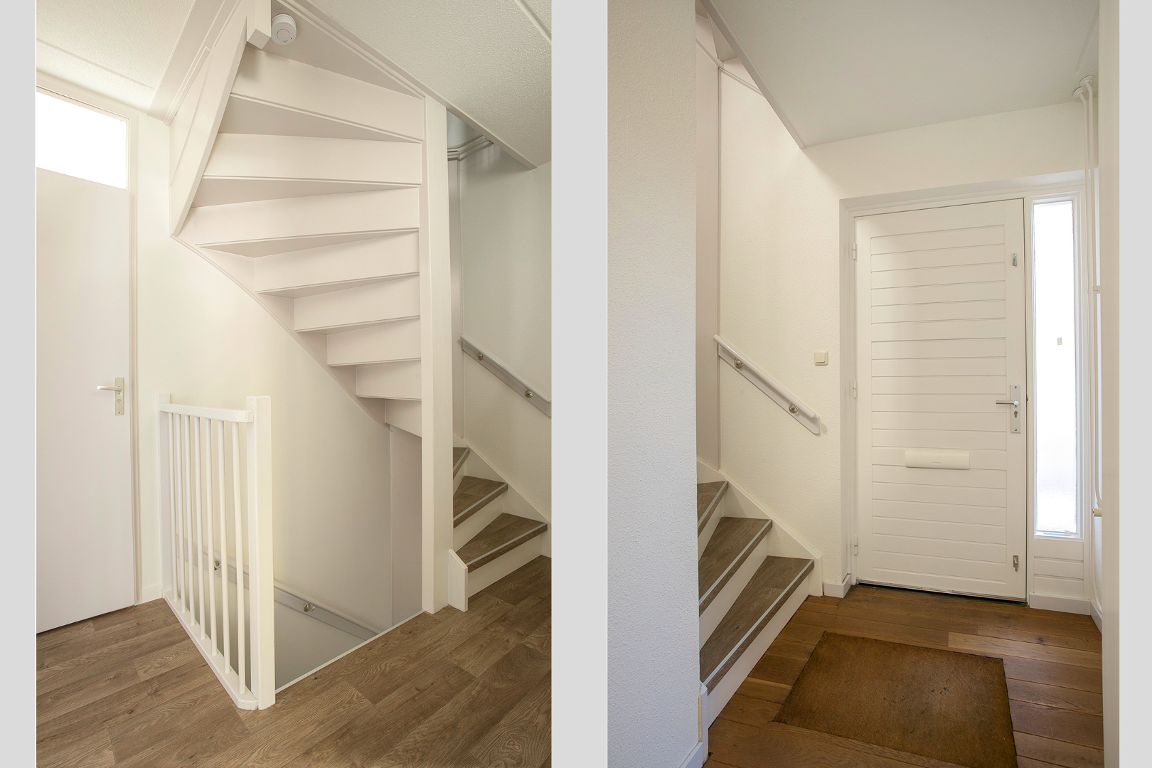 Hal aan de zijkant van de woning (onder de carport) met toegang tot de trapopgang, garderoberuimte, meterkast en woonkamer.