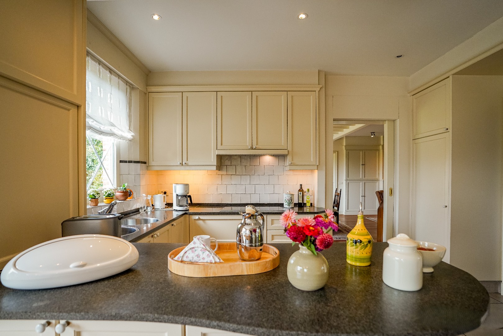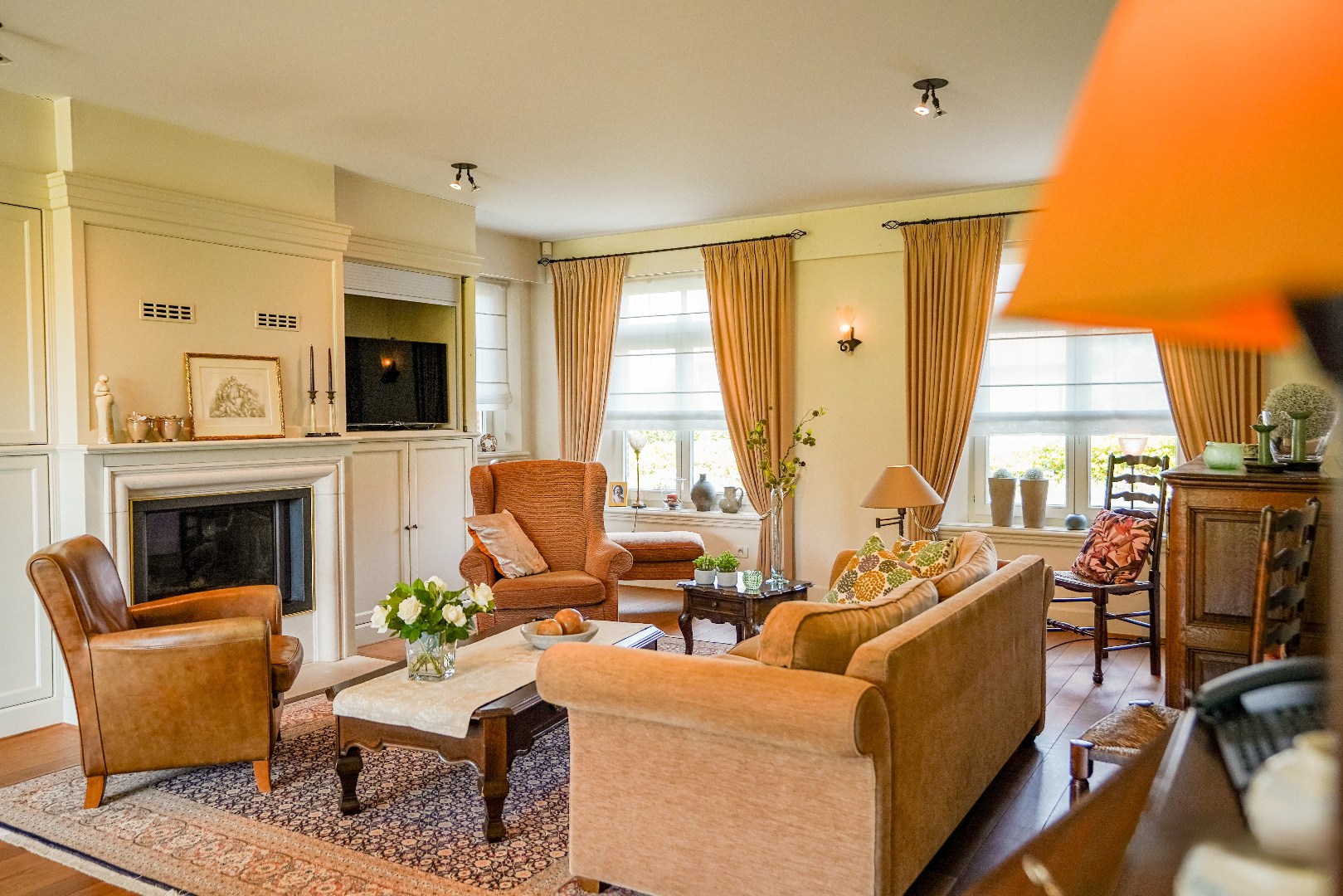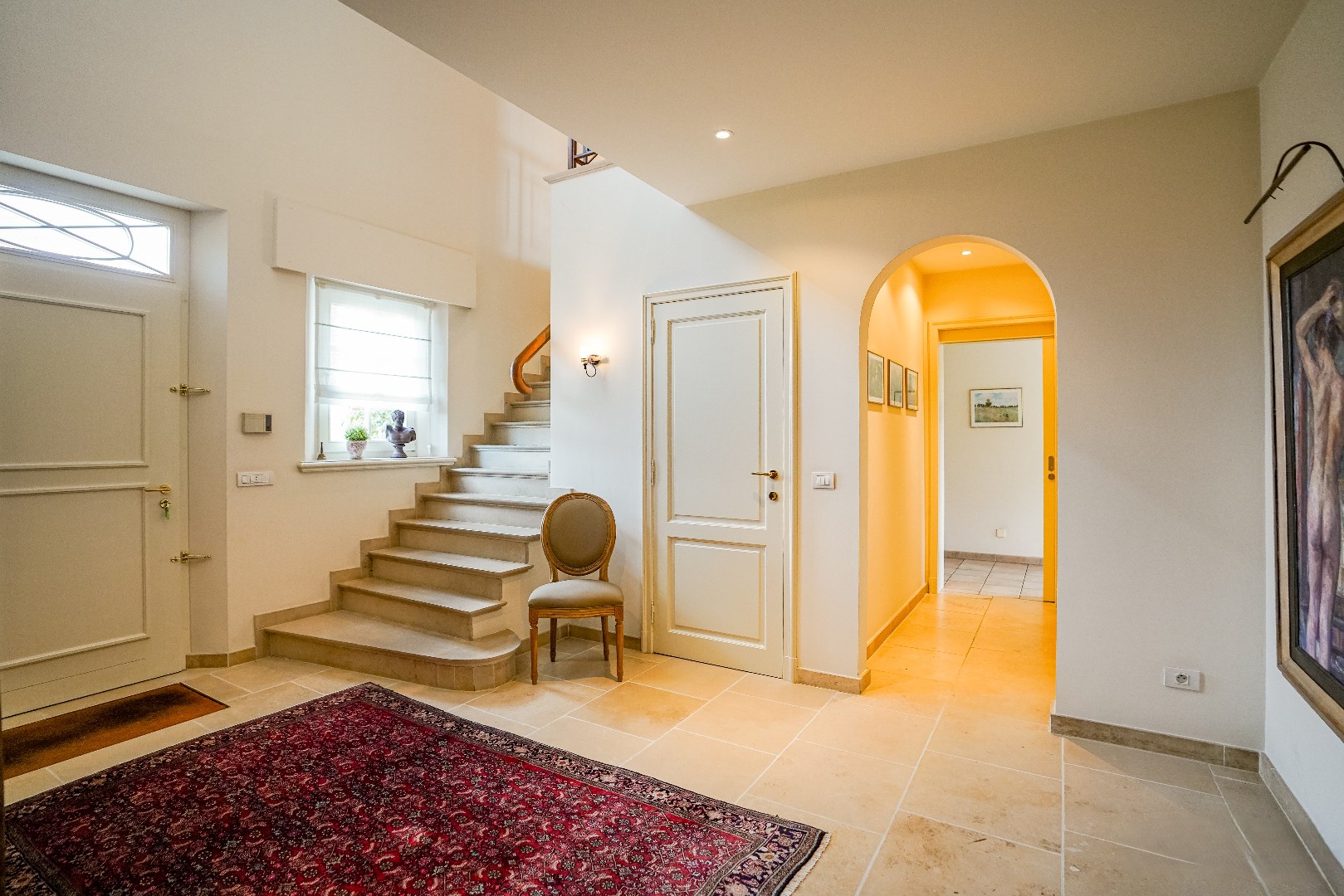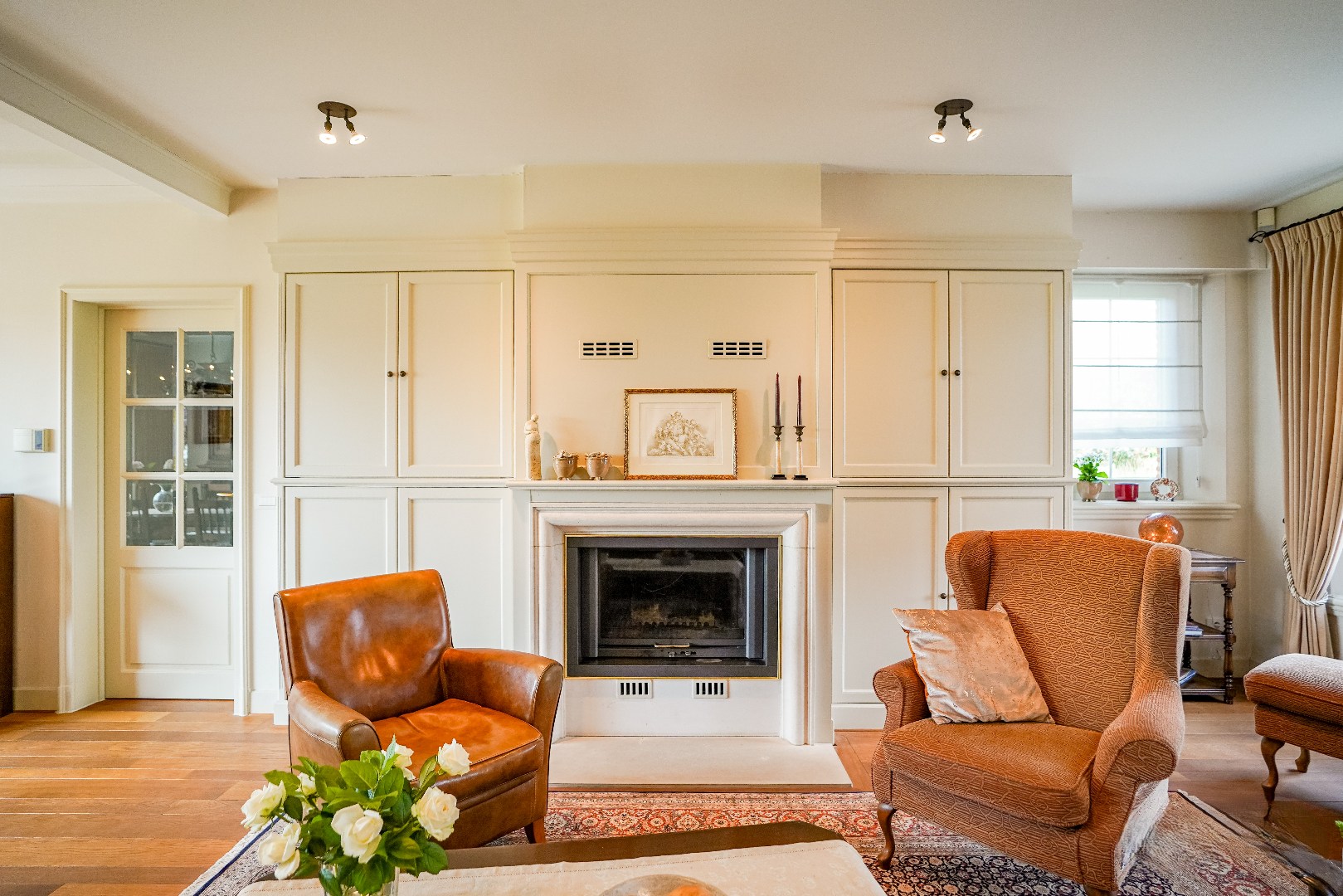 Via de royale hal met imposante marmeren trap en vestiaire betreedt u deze stijlvolle woning. De ruime woonkamer met parketvloer en open haard ademt warmte en klasse uit, en biedt dankzij het grote raampartij een prachtig zicht op de verzorgde tuin. Aansluitend bevindt zich de gezellige tuinkamer, eveneens met tuinzicht, en een ingericht buro – ideaal voor wie thuis werkt.