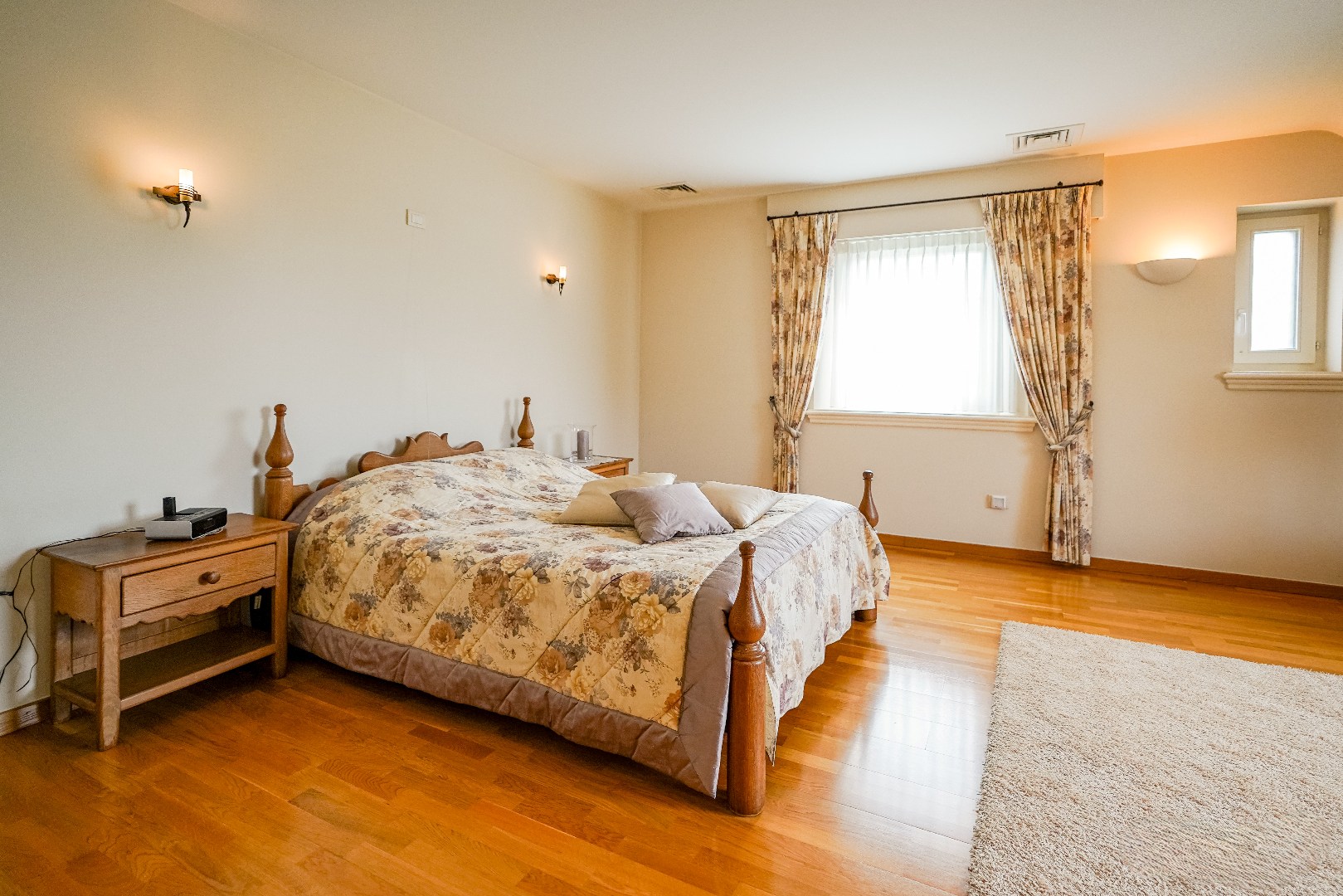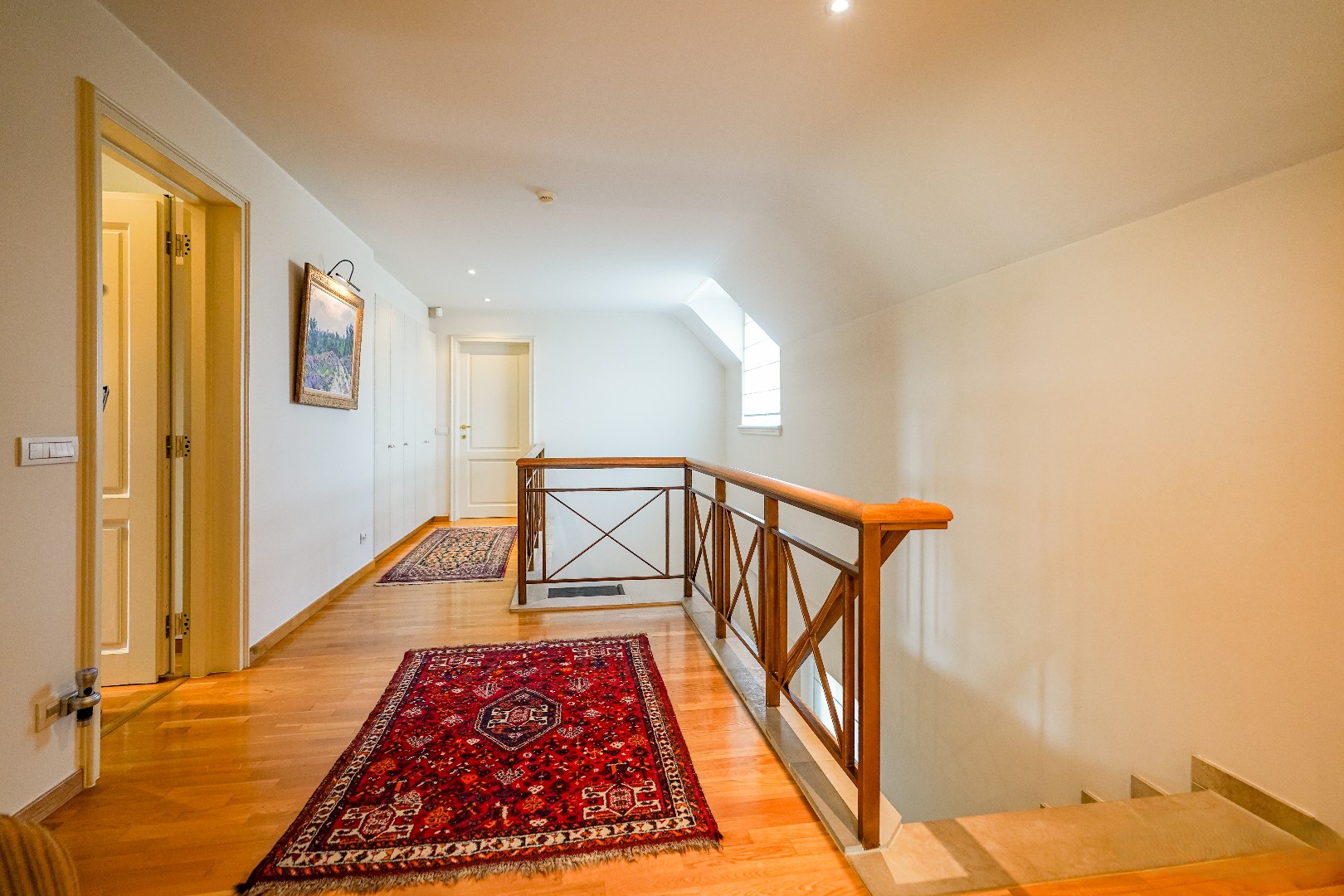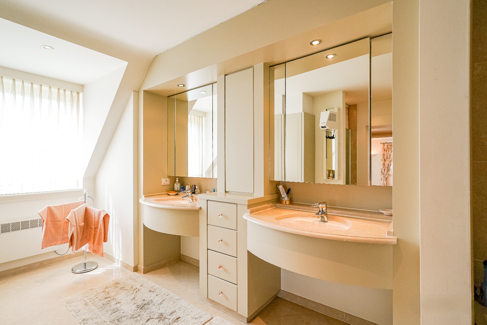 De verdieping biedt vier royale slaapkamers, waaronder een master bedroom met ingerichte dressing en eigen badkamer met bubbelbad, dubbele wastafel, douche en een apart toilet. Daarnaast is er een tweede badkamer met douche, wastafel en toilet. De ruime overloop geeft toegang tot twee zolderkamers die eenvoudig kunnen worden omgevormd tot extra slaapkamers of hobbyruimtes. Via een vlizotrap bereikt u nog een praktische bergzolder.