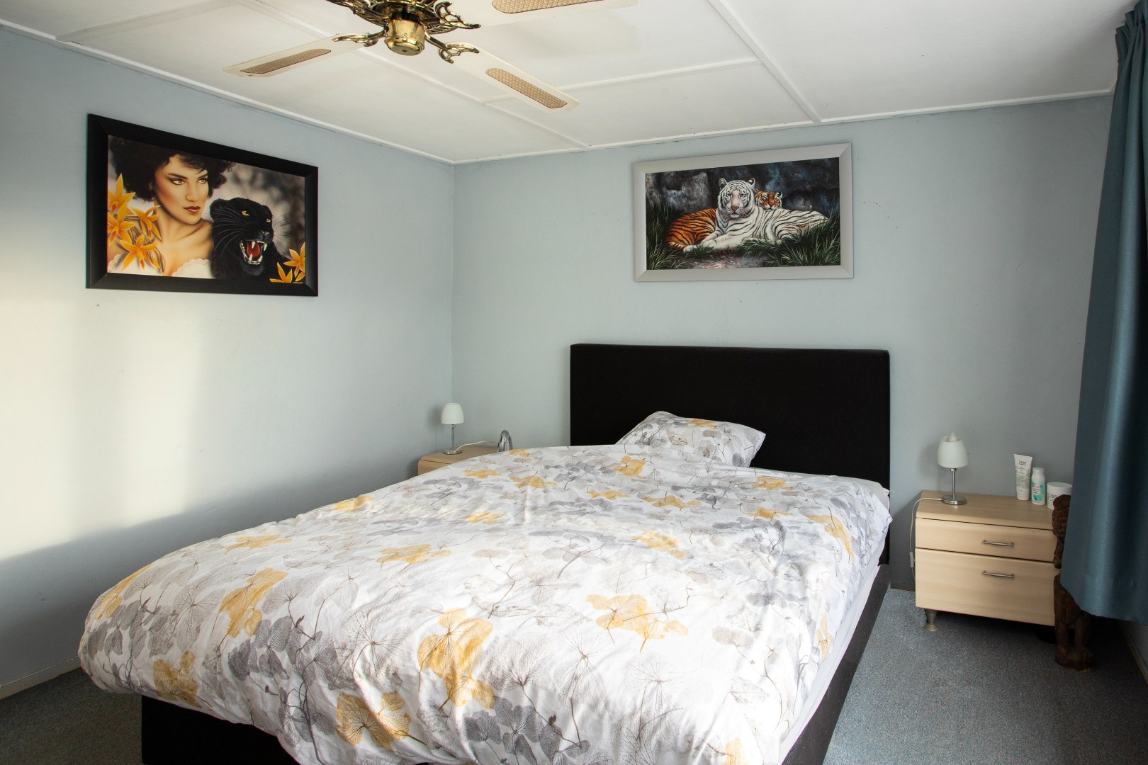De slaapkamer aan de achterzijde is uitgevoerd met vloerbedekking, kunststof plafond, kunststof kozijnen met isolerend glas en een draai-kiep raam.