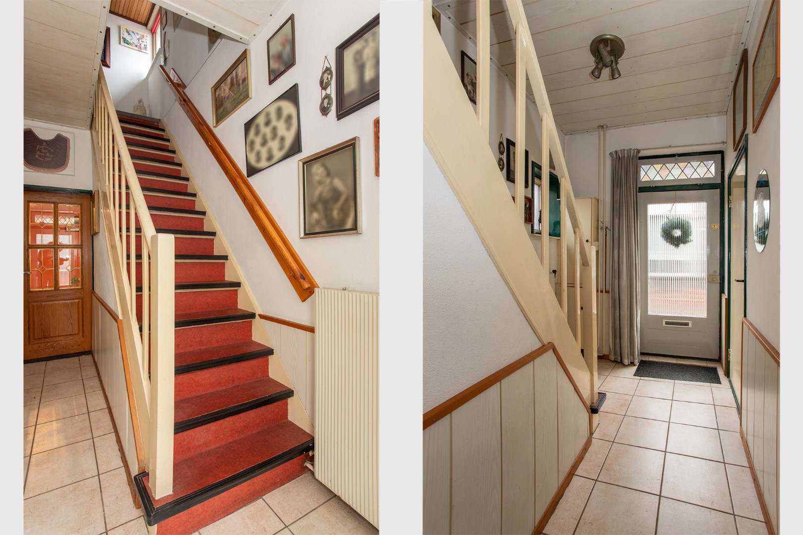 Ruime hal met een tegelvloer, trapopgang naar de eerste verdieping, geheel betegelde toilet met verwarming, garderoberuimte en een ruimte met aansluitingen voor wasmachine en droger.