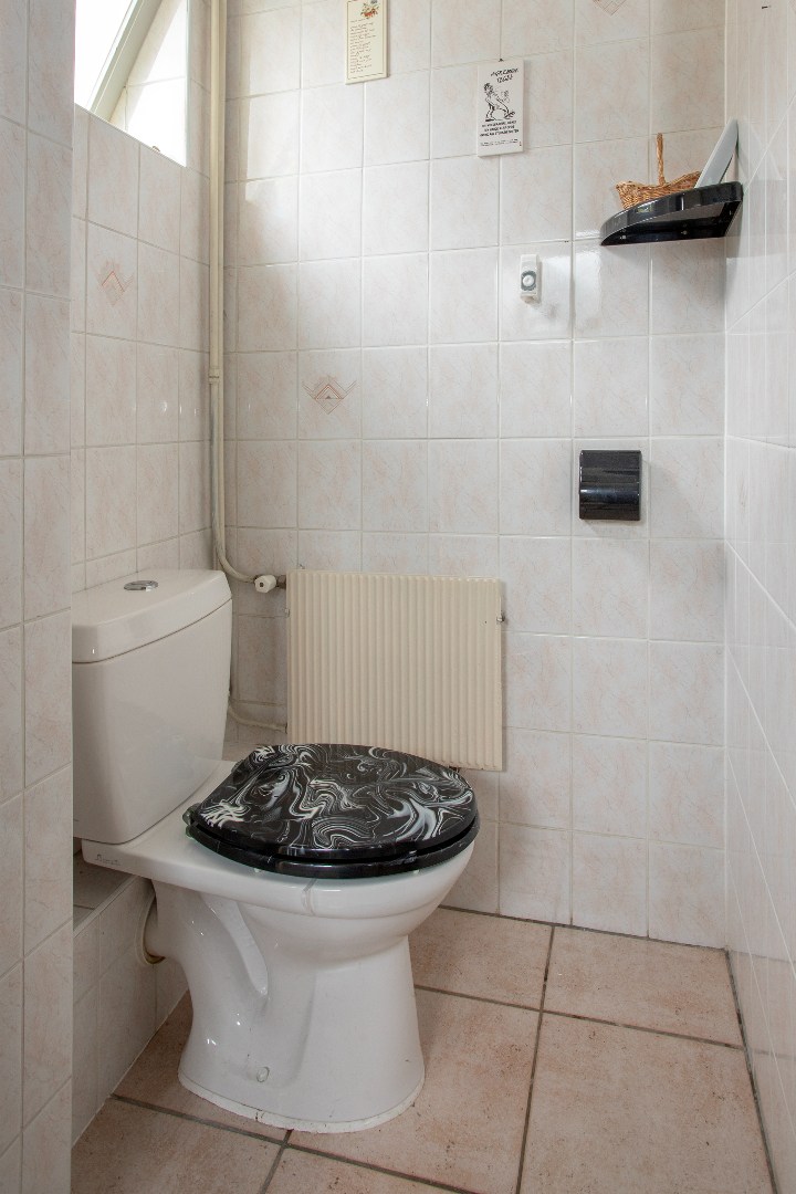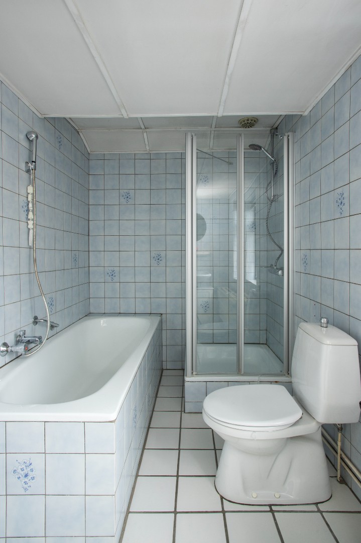 De geheel betegelde badkamer is inclusief toilet, douchecabine en een ligbad.