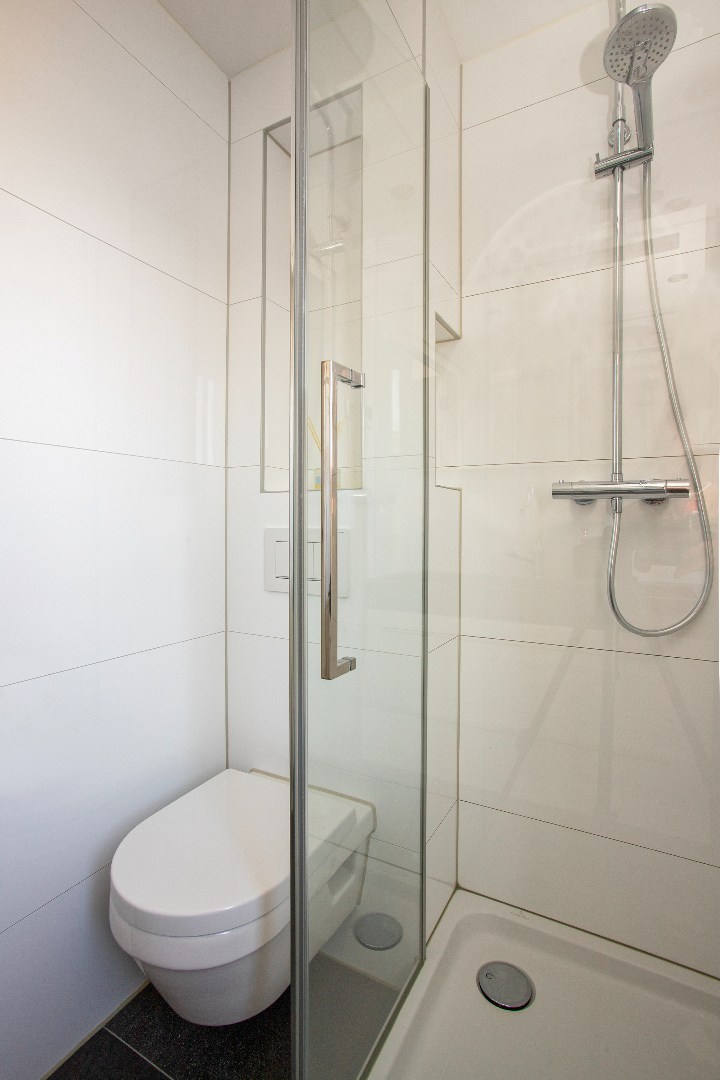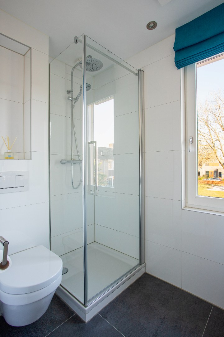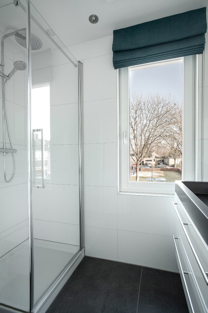 De geheel betegelde badkamer heeft een draai-kiep raam, wandcloset, douche cabine, mooi plafond met verwarmingsunit, elektrische vloerverwarming en een badmeubel.