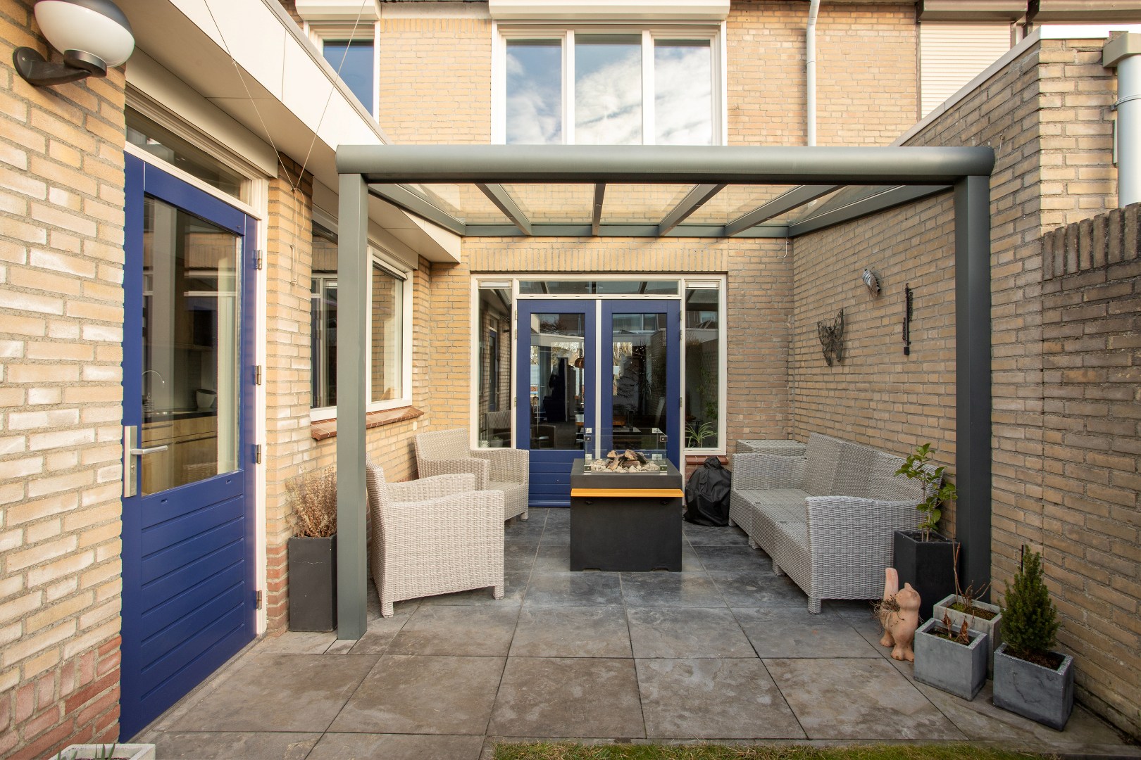 Vanuit het portaal loop je in de achtertuin onder een royale overkapping door.