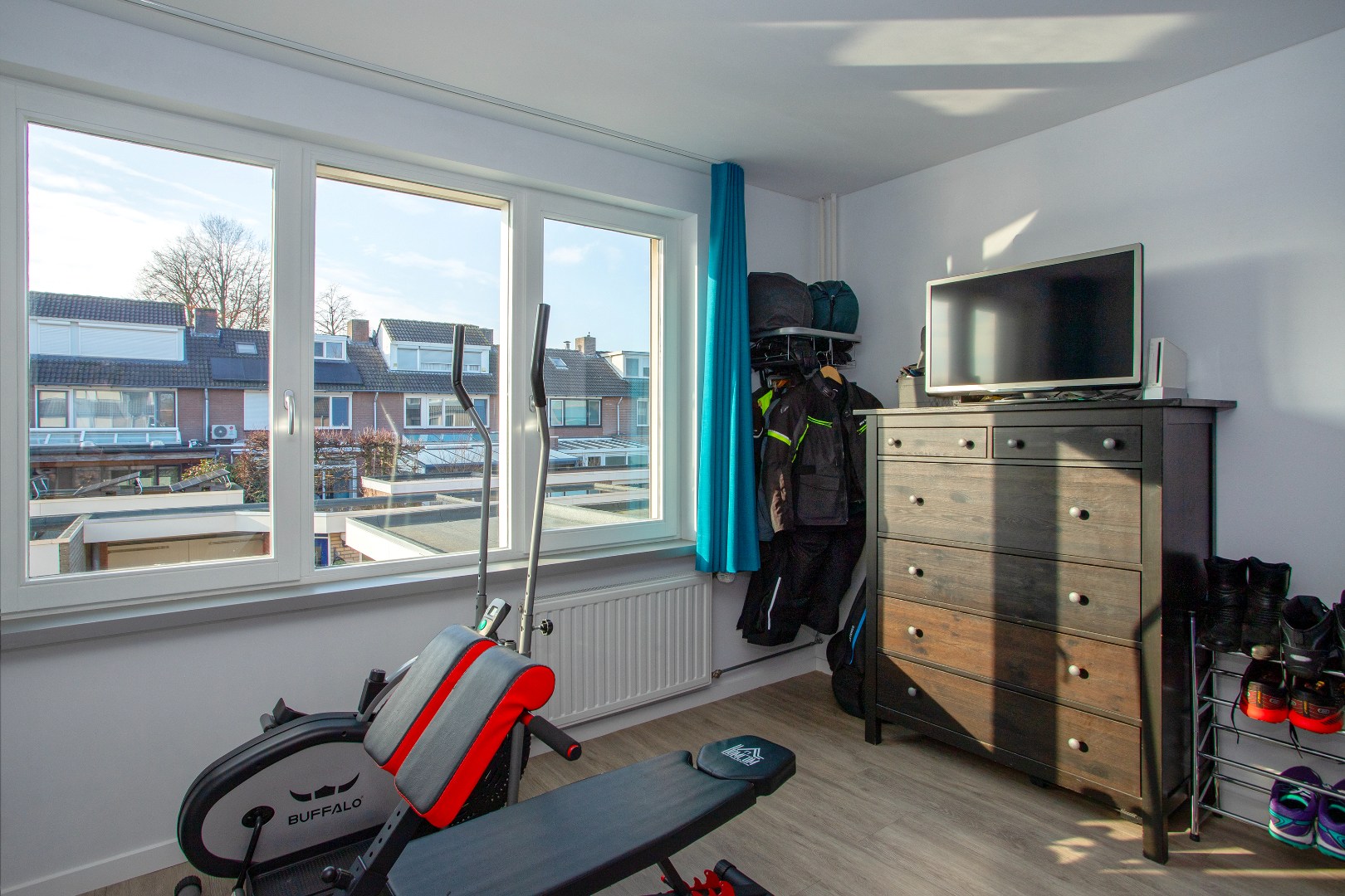 De kinderkamer heeft een inbouwkast, een plafond van gestucte gipsplaat en een draai-kiep raam.