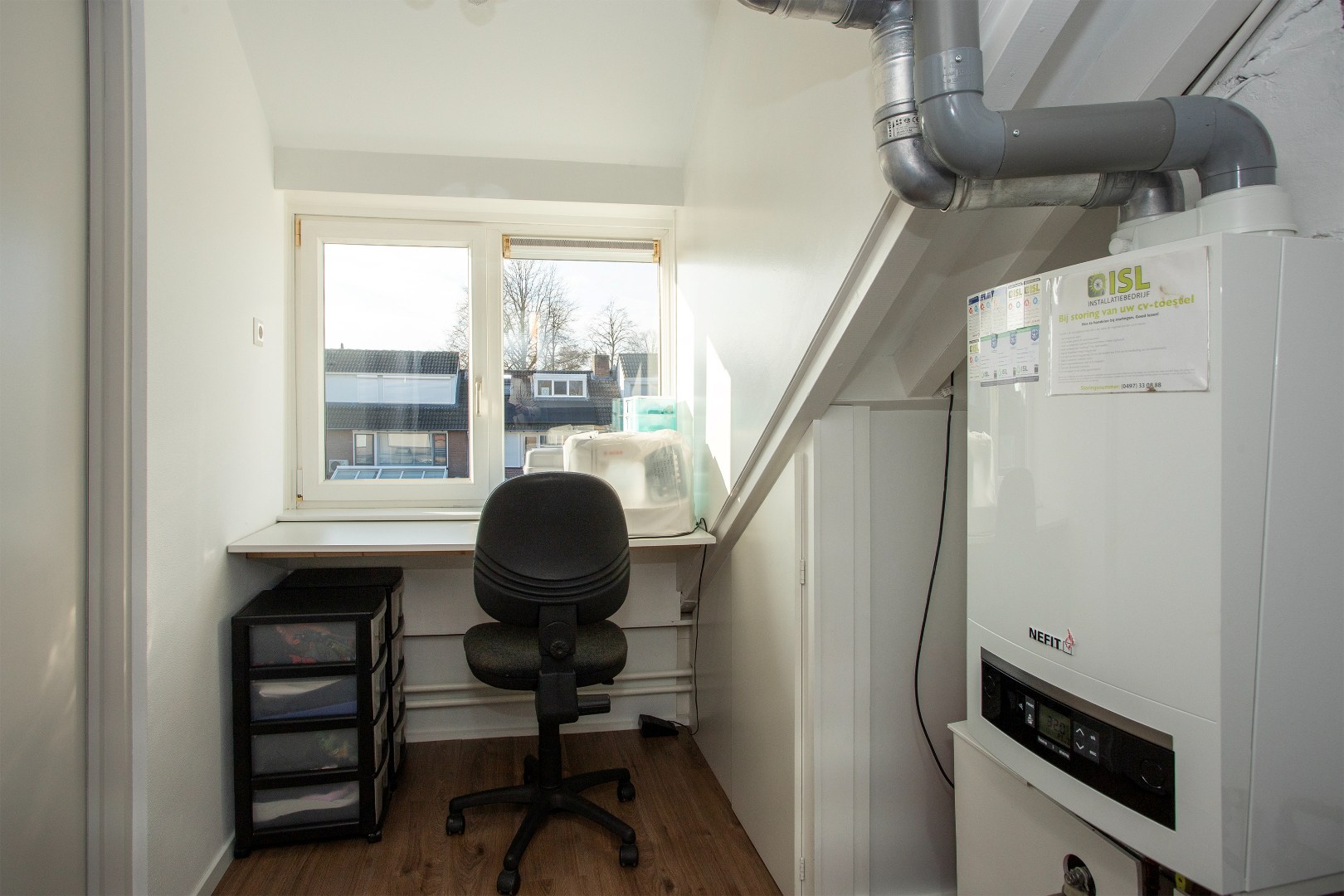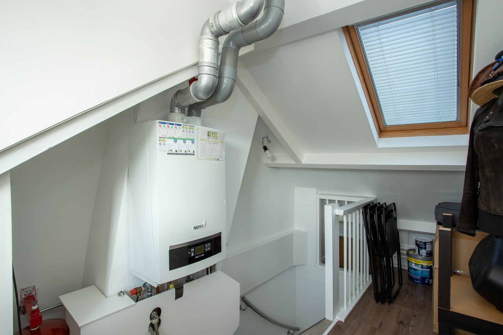 Middels een vaste trap kom je op de voorzolder met dakraam, laminaat vloer en de opstelling van de gasgestookte Nefit ketel met het bouwjaar: 2014.