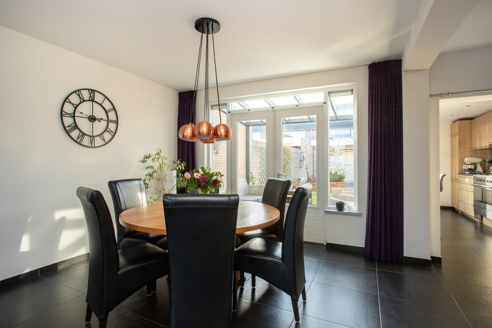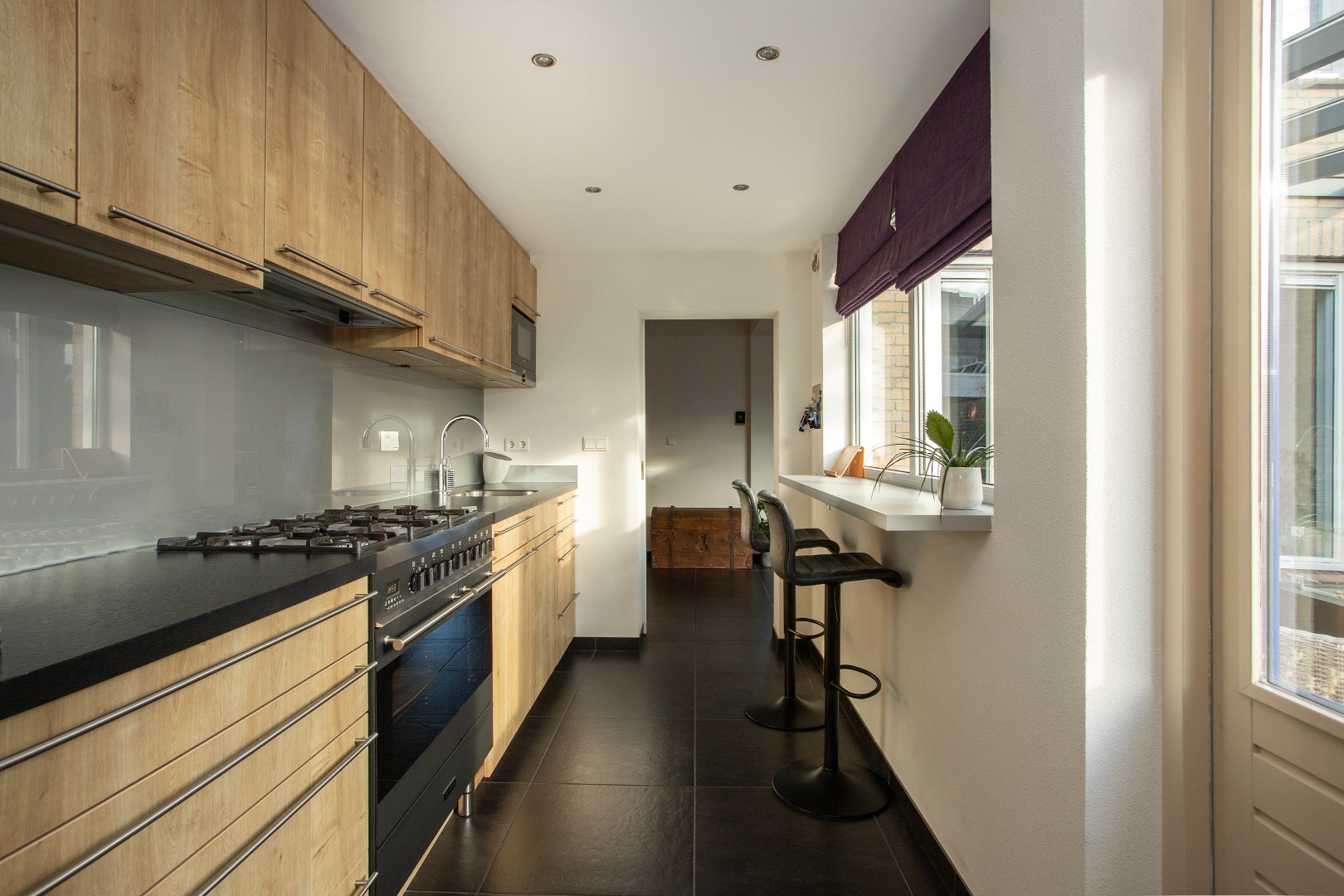 Met een handige schuifdeur loop je de eetkeuken binnen. De zwarte tegelvloer loopt vanuit de woonkamer door de keuken. De keukenopstelling heeft een zwart werkblad, fornuis van M.Systems ( en andere apparaten) met 6 pitten, dubbele oven, veel ladekasten aan de onderzijde, grote koelkast en diepvrieskast, veel bovenkastjes, combimagnetron (Siemens) en een vaatwasser.