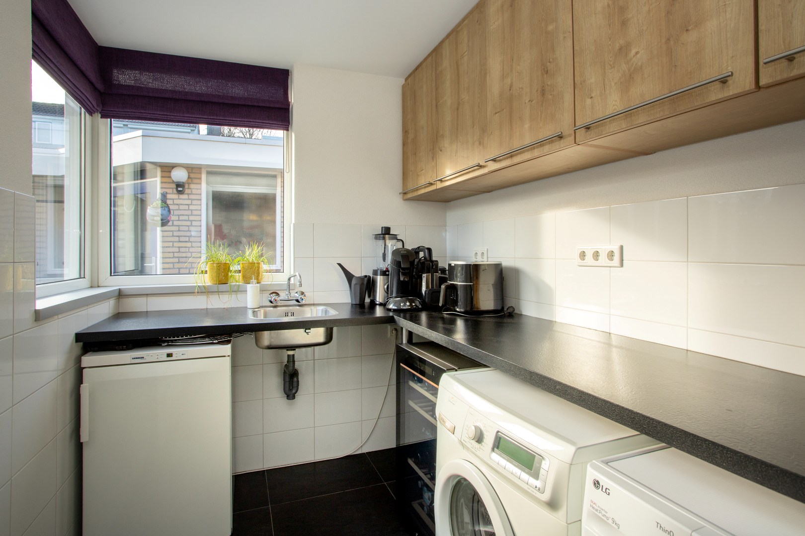 Hier zitten de aansluitingen van de wasmachine en droger, handige wasbak en bovenkastjes, verlaagd plafond met inbouwverlichting, kunststof kozijnen met isolerend glas en afvoerpuntje in de mooie tegelvloer.