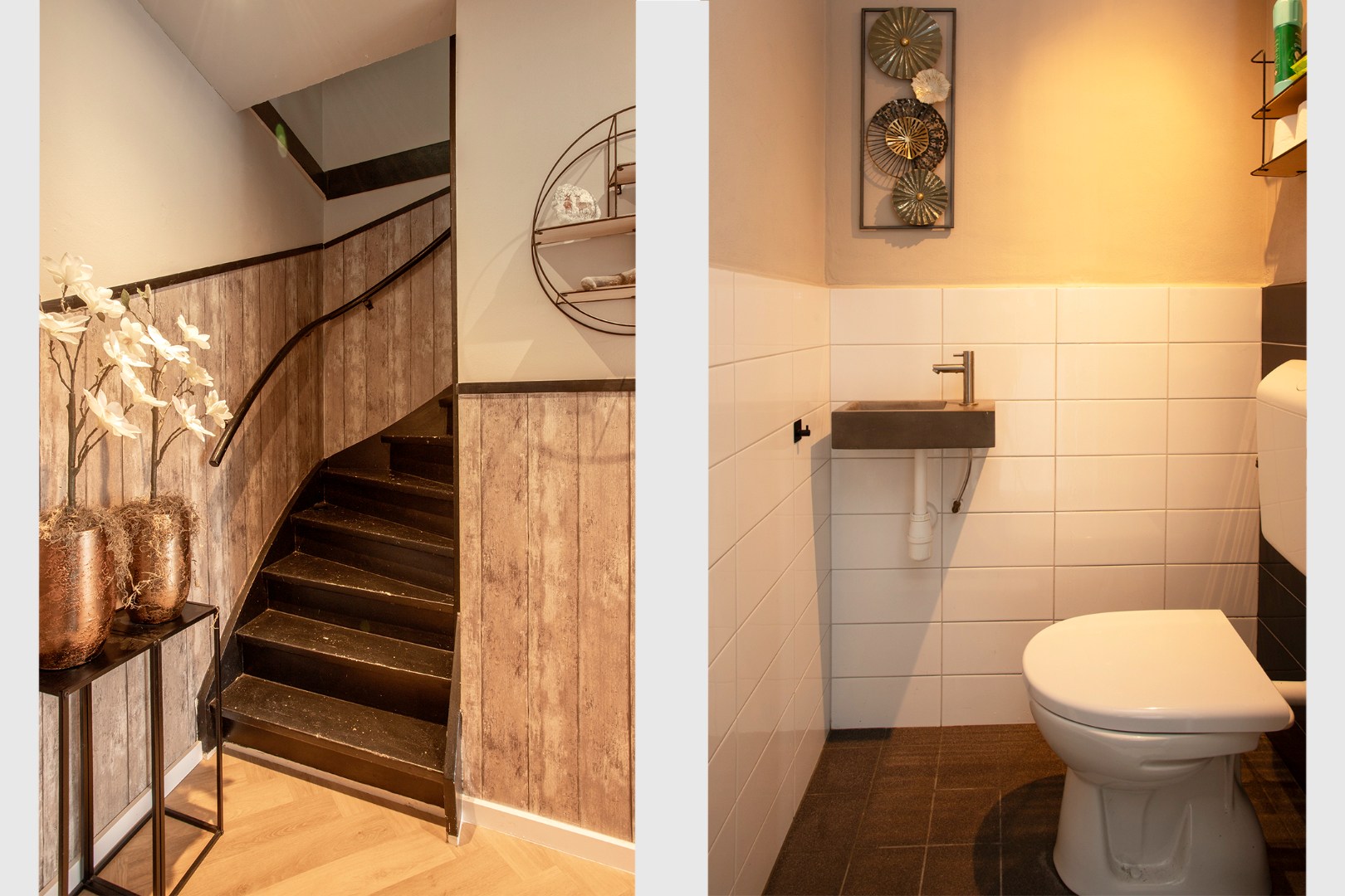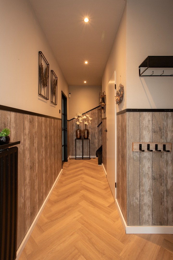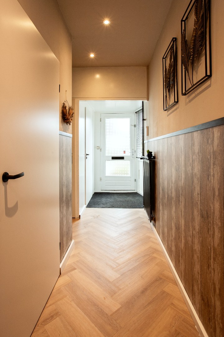 Je loopt over een pvc visgraad vloer deze middenwoning binnen. Hier heb je toegang tot een kelderkast met veel ladeplanken en kruipruimte, toegang tot de garderobe ruimte, trapopgang, meterkast incl. glasvezel aansluiting en een half betegelde toilet met fonteintje.