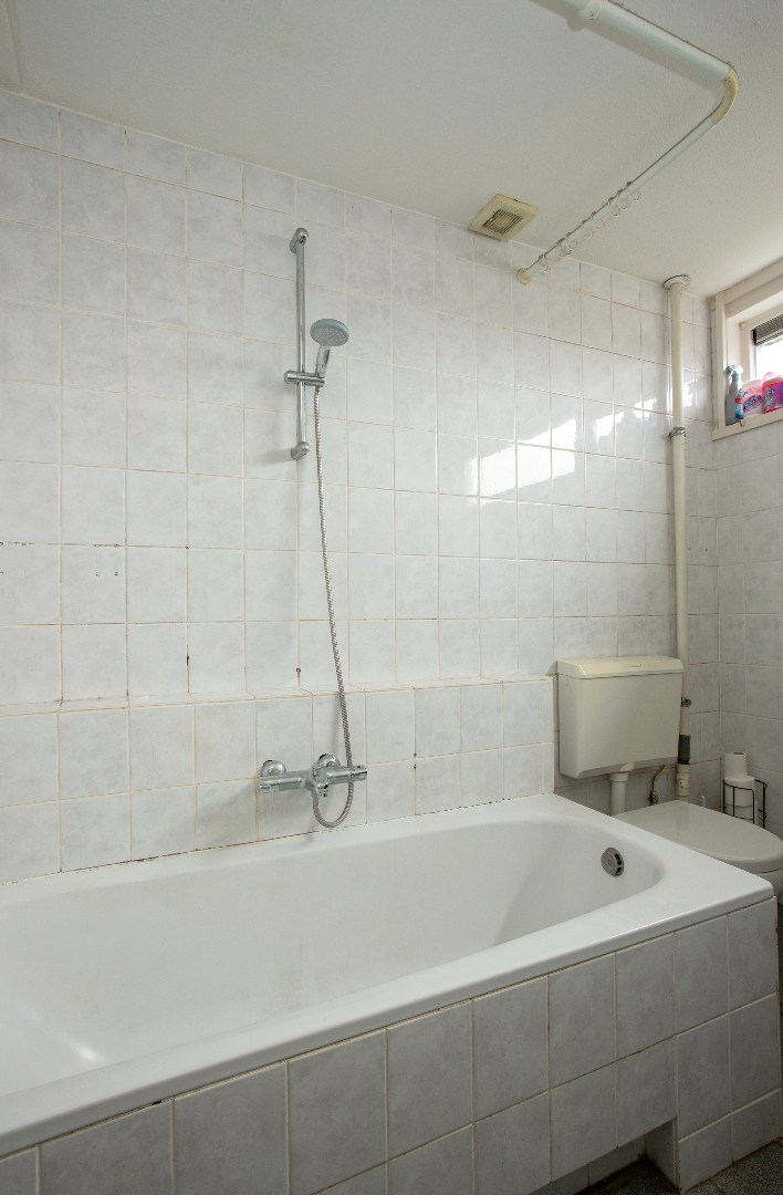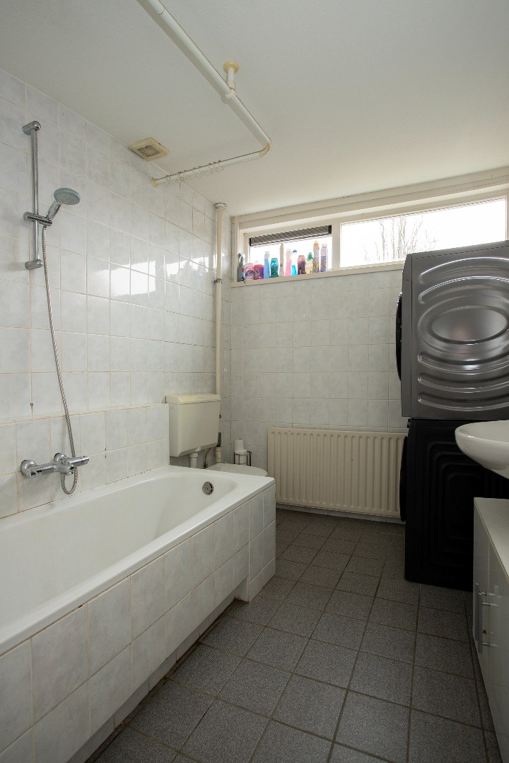 De geheel betegelde badkamer heeft een ligbad, toilet en vaste wastafel. Ventilatieroosters in de houten kozijnen met isolerend glas.