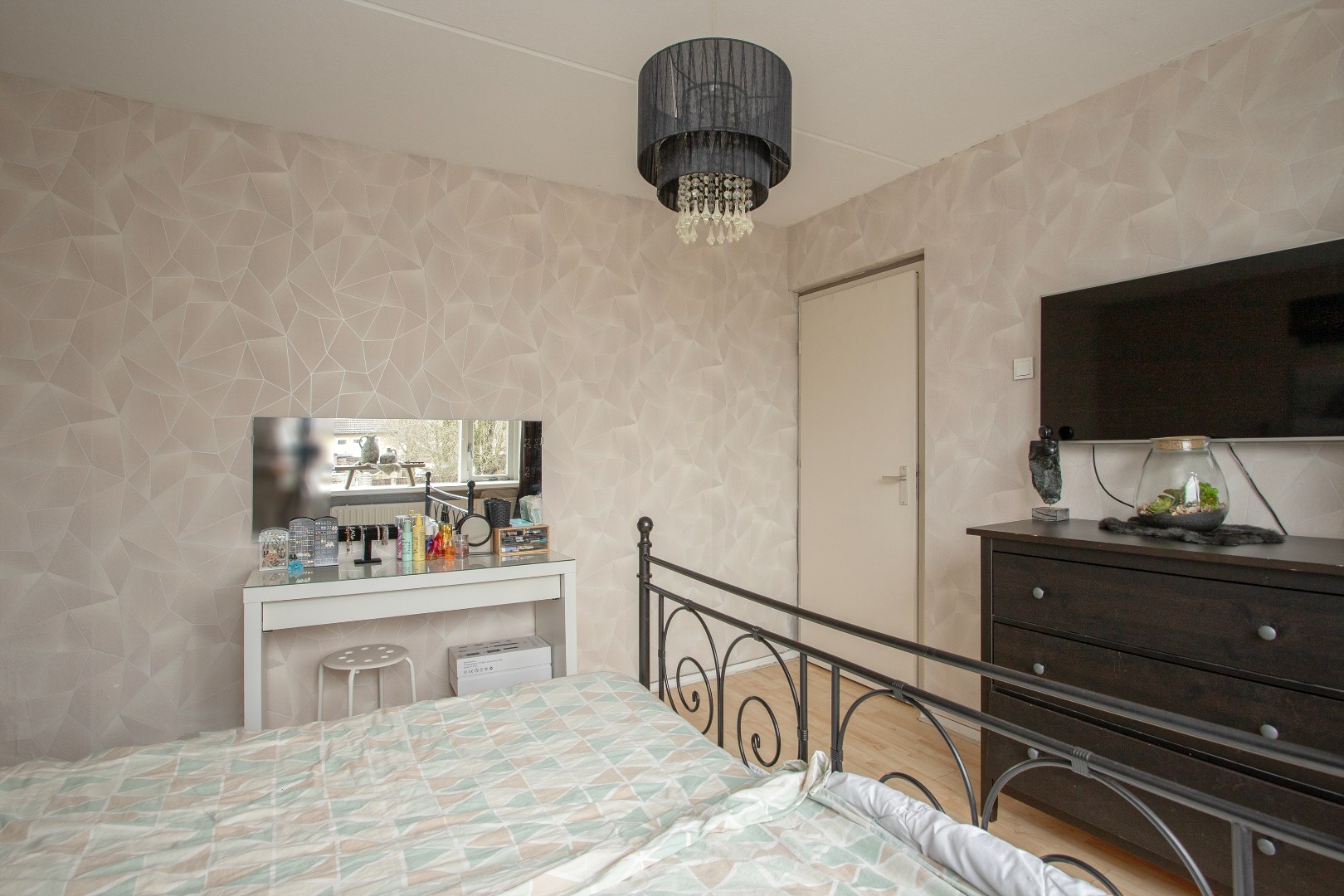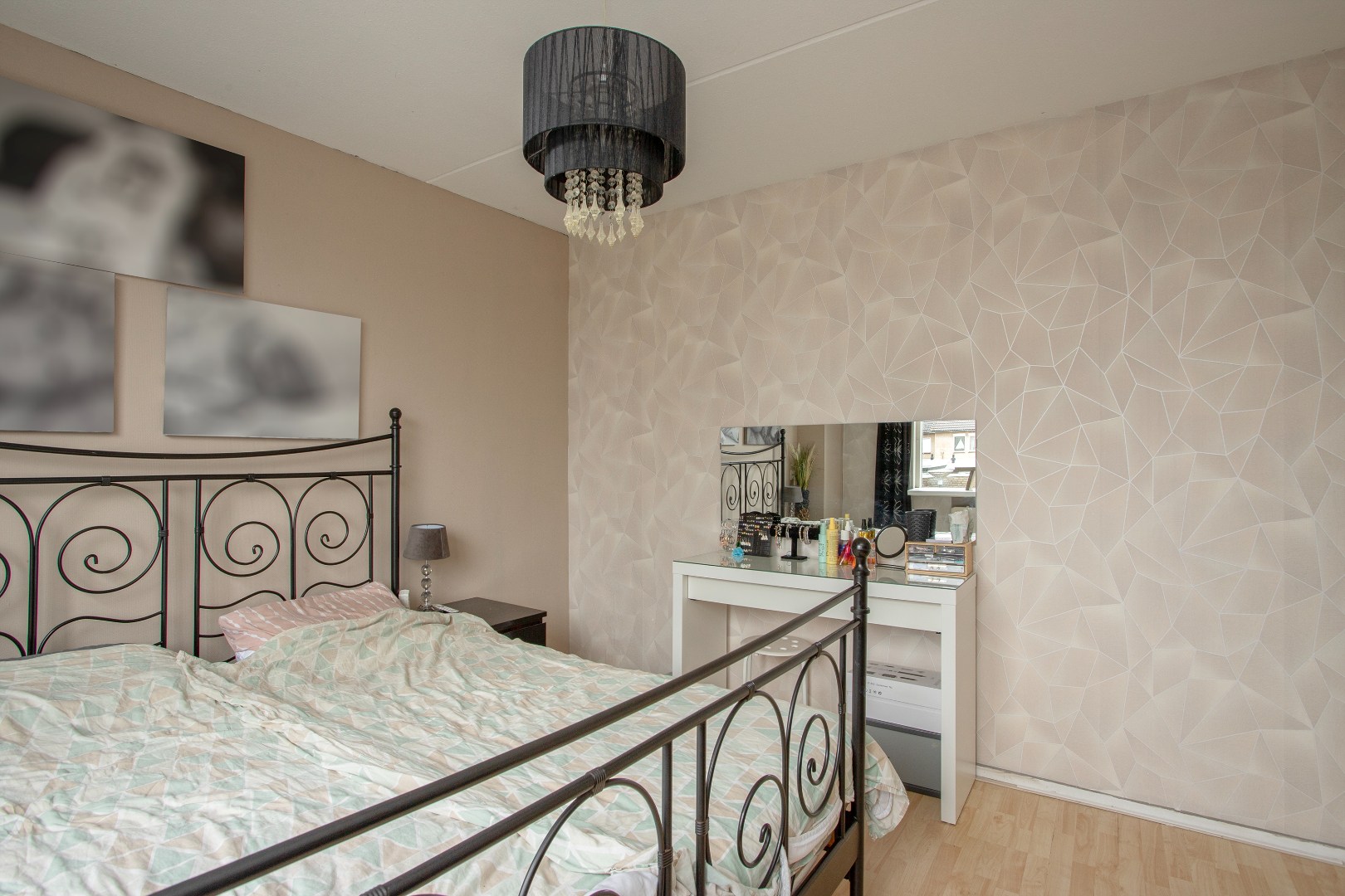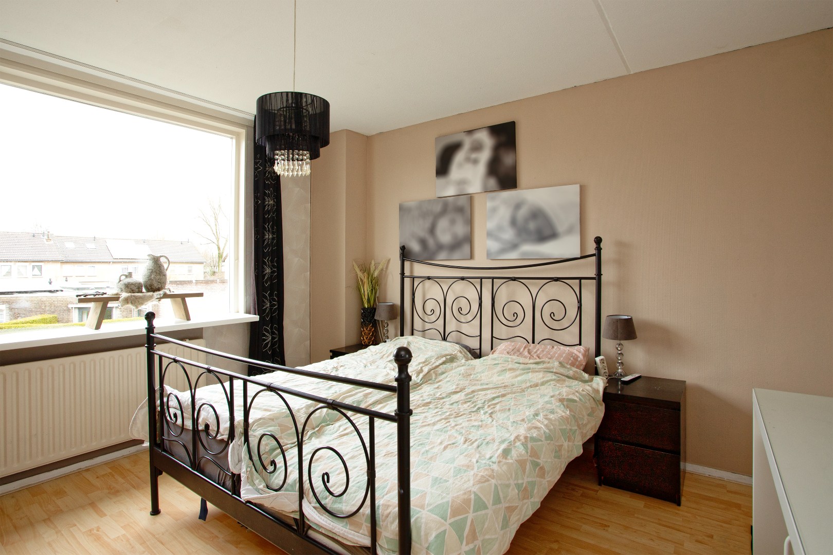 De slaapkamer aan de achterzijde is ook ruim opgezet en is voorzien van kunststof kozijnen met een draaikiep raam met isolerend glas en een laminaat vloer, ventilatierooster en grotendeels behangen wanden.