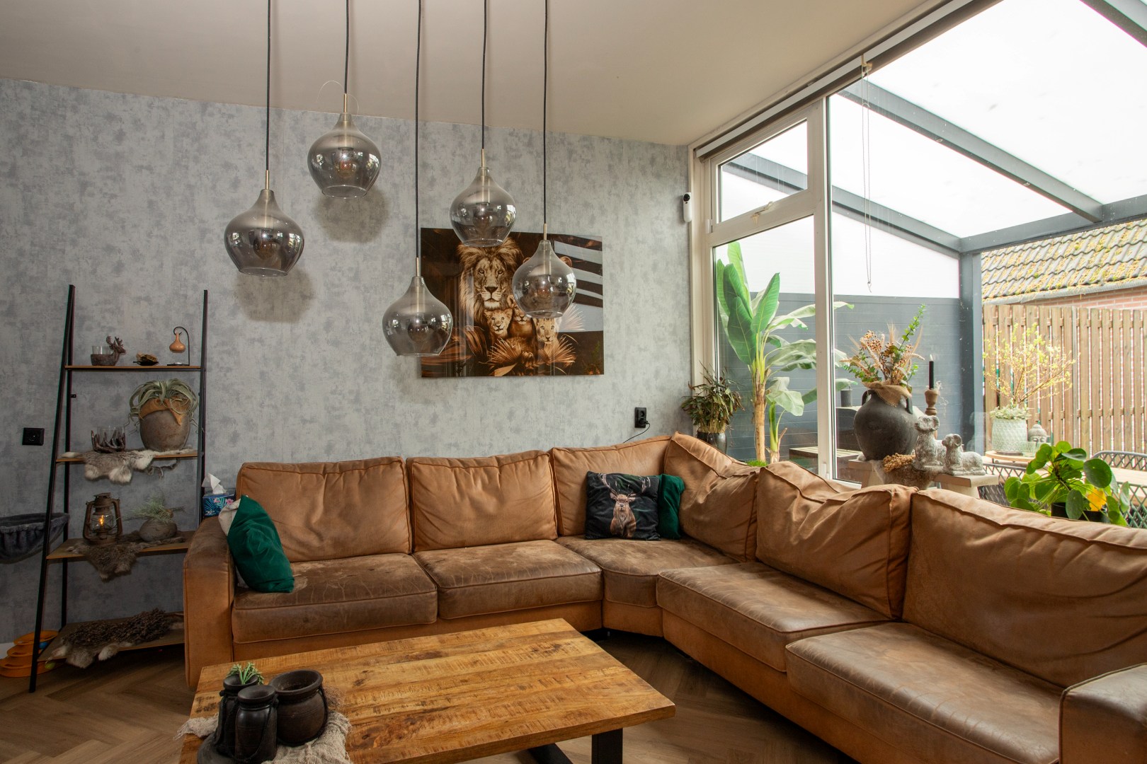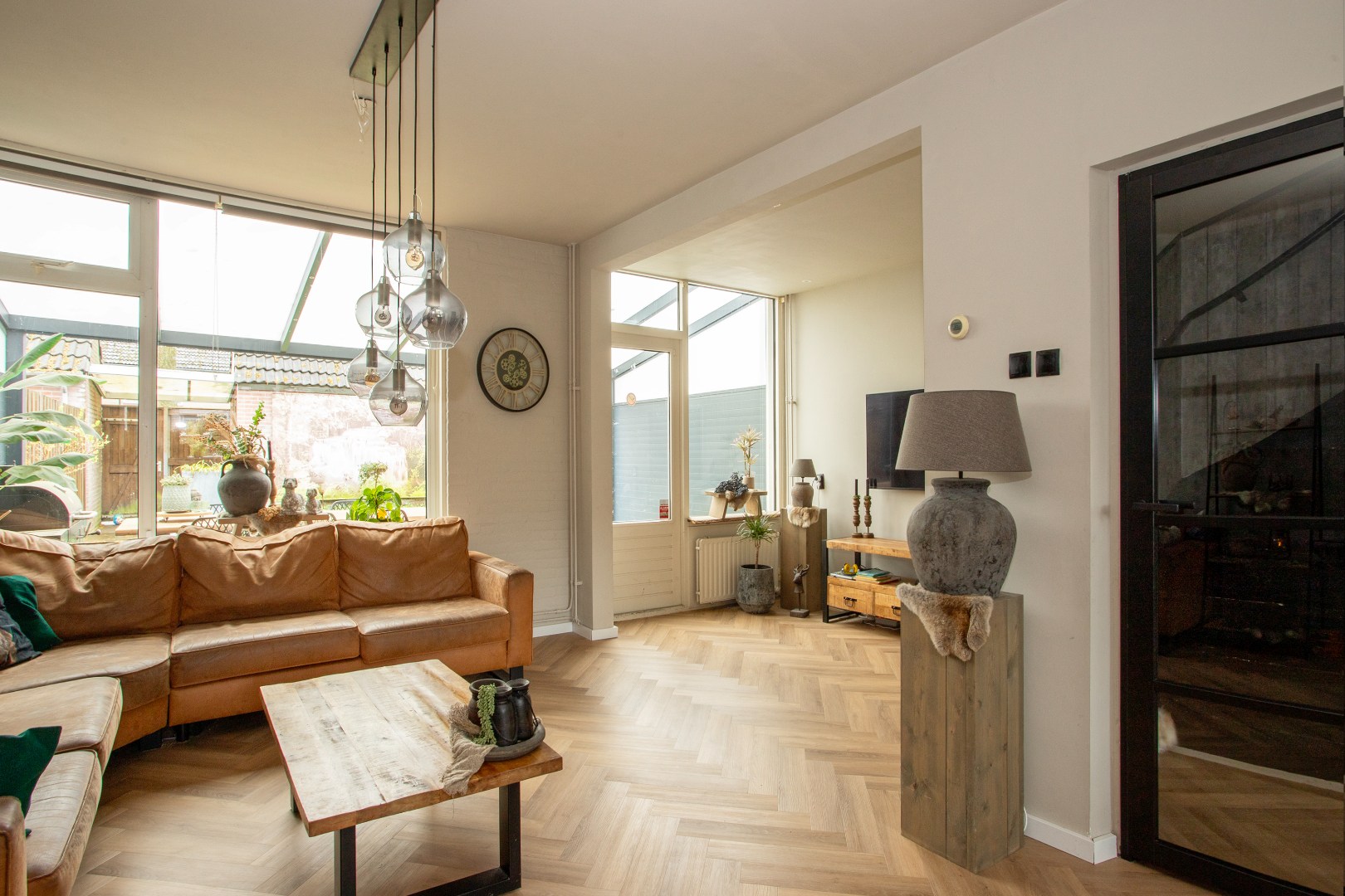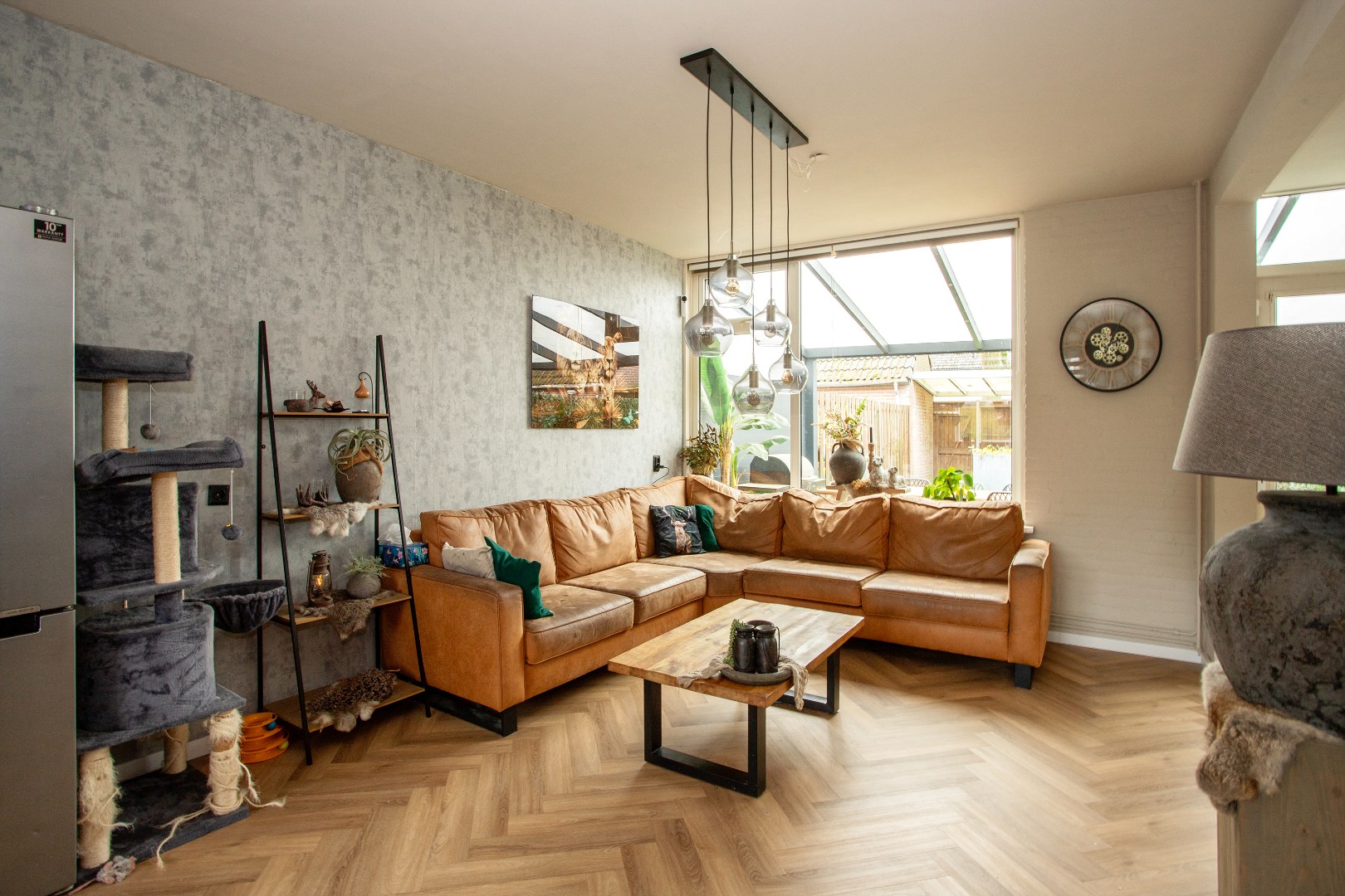 In de ruime lichte L-vormige woonkamer met een pvc visgraad vloer, tref je behangen wanden, aan de voorzijde houten kozijnen met isolerend glas en aan de achterzijde gedeeltelijk hout en kunststof kozijnen met isolerend glas. Over de gehele breedte is een gezellige overkapping waarvan je de achtertuin inkijkt. De overkapping heeft diepte van drie meter met veel privacy.
