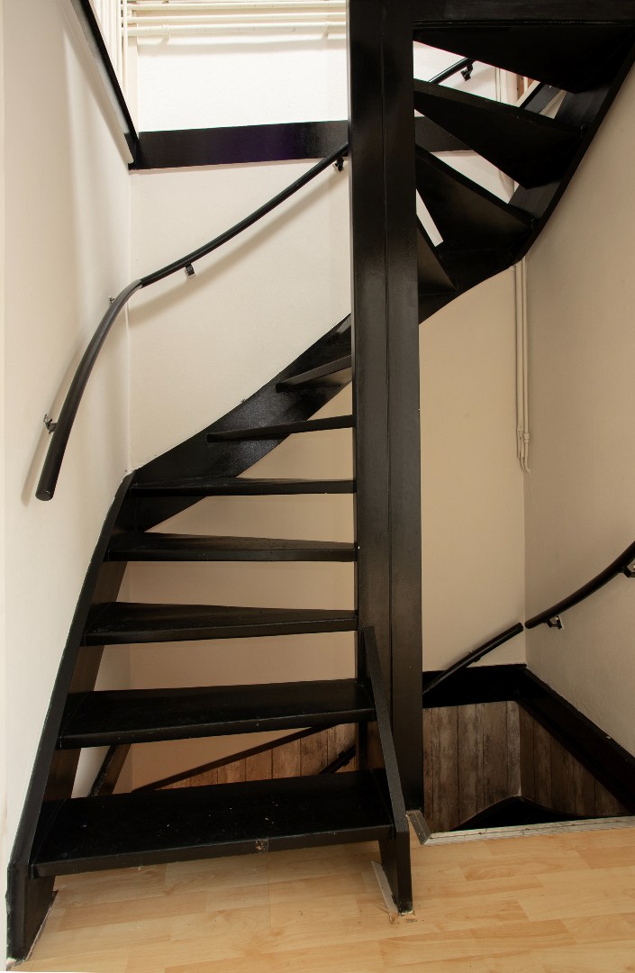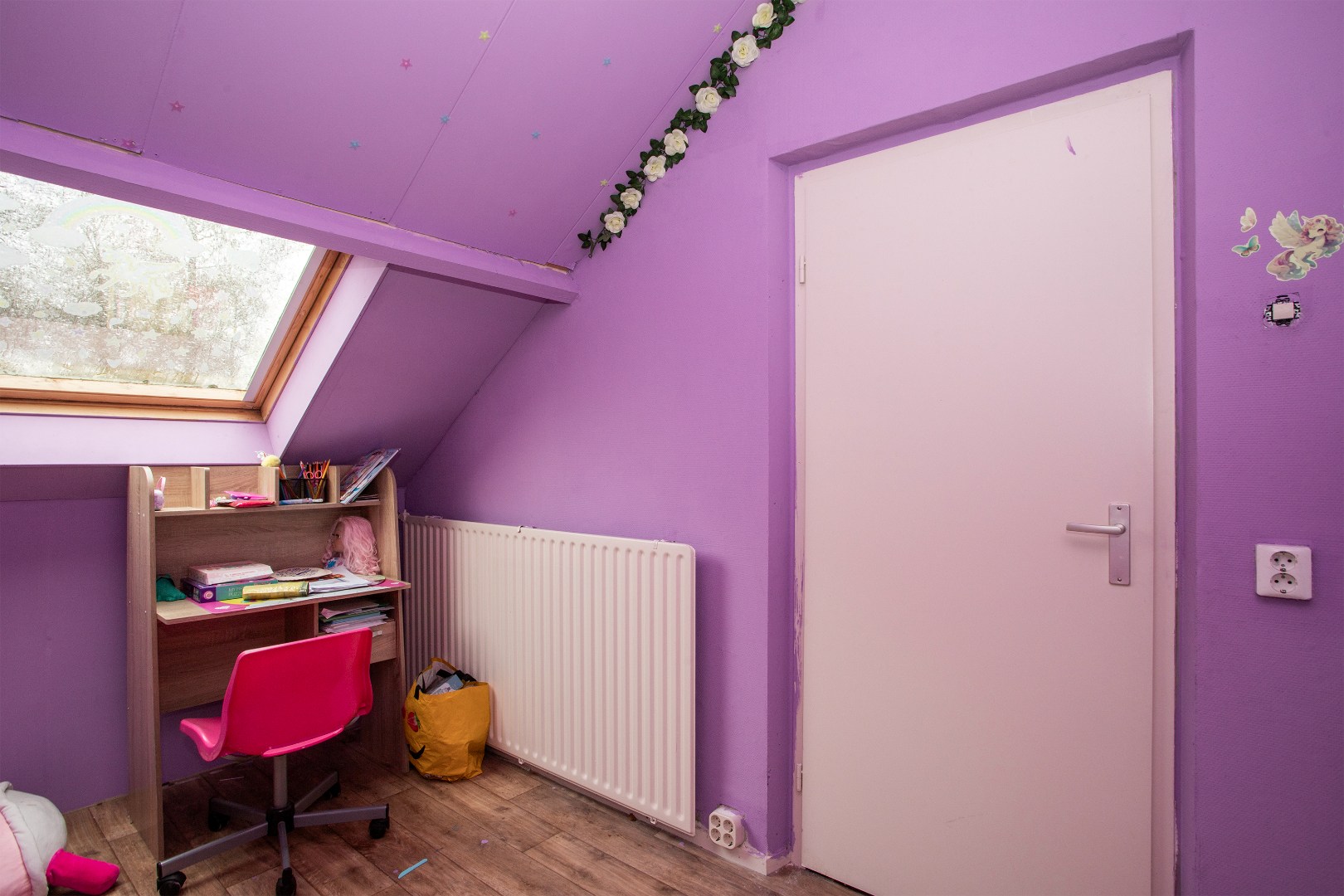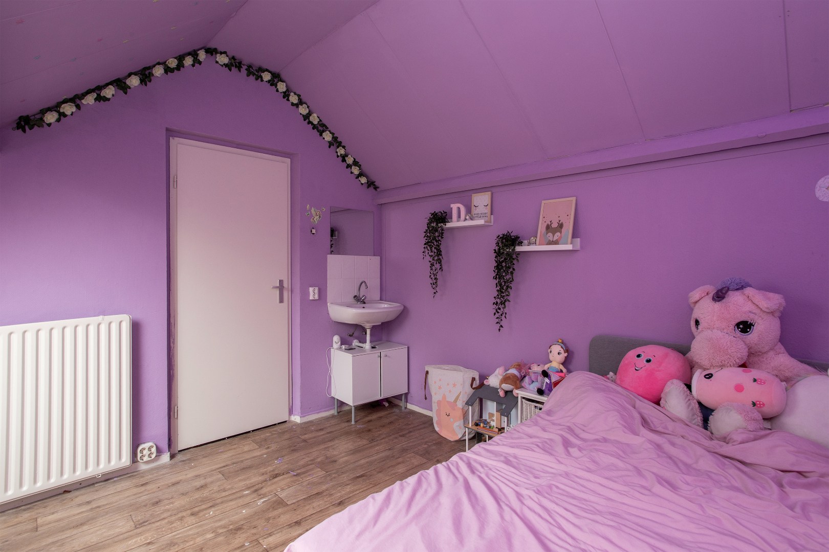 Op de zolderkamer ( afsluitbaar) tref je een grote slaapkamer met een vloer van zeil, verwarming via een radiator, vaste wastafel, behangen wanden en een groot dakraam.