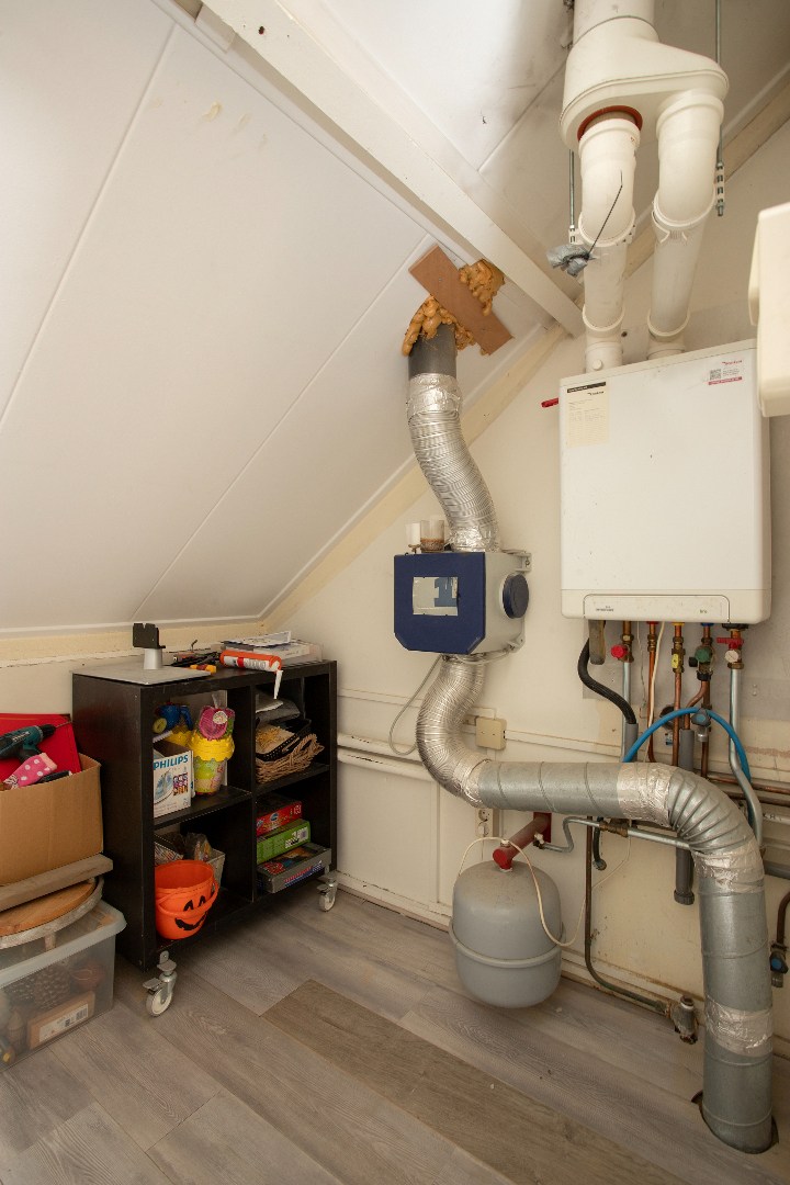Middels een vaste trap kom je op de voorzolder die voorzien is van een dakraam, de opstelling van de gasgestookte CV ketel met het bouwjaar: 2016 en de centrale unit van de luchtverversing.
