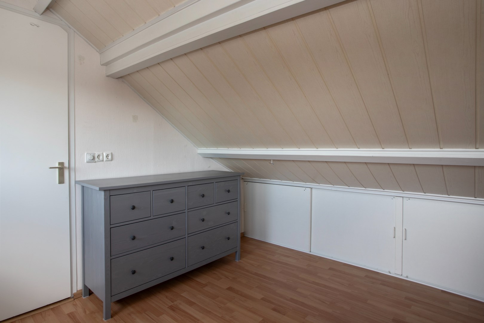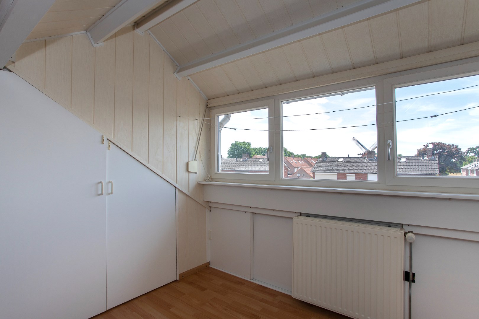 Ruime kamer met brede dakkapel, kunststof kozijnen met twee draai-/kiepramen, verwarming en veel bergruimte achter de knieschotten. Geschikt als slaap- of studeerkamer.