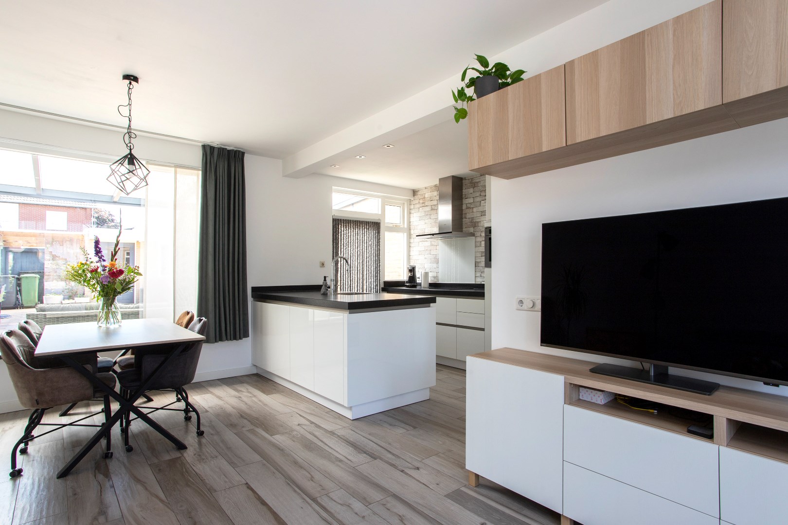 Centraal in de woning ligt de moderne open keuken met een royaal kookeiland voorzien van spoelbak, vaatwasser en opbergruimte aan beide zijden. Daarnaast vind je een inductiekookplaat, afzuigkap, combimagnetron, koelkast en vriezer. Het gestucte plafond met inbouwspots maakt het geheel compleet. Praktisch is ook de kelderkast onder de trap.