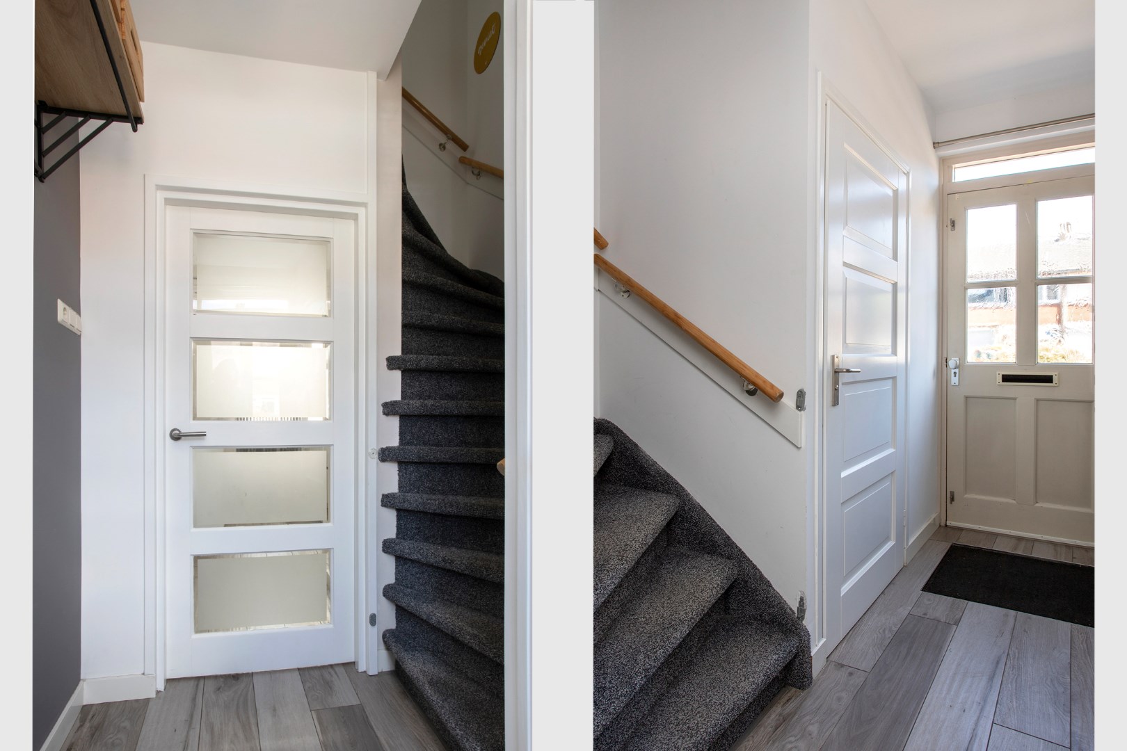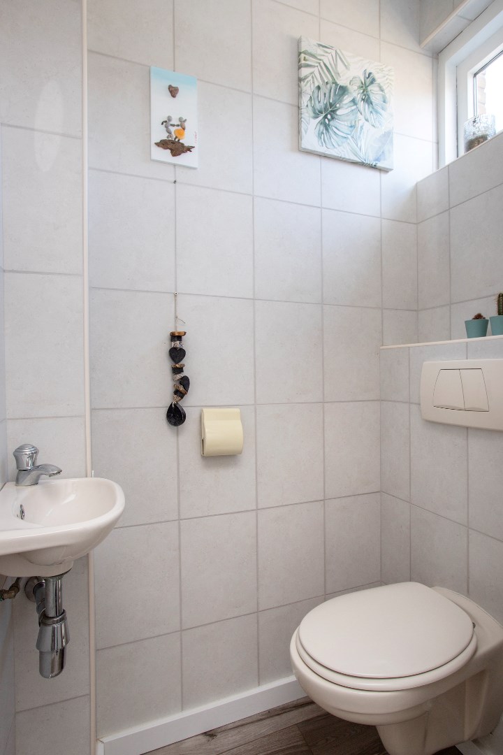 De hal biedt toegang tot een modern afgewerkte toiletruimte met wandcloset en fonteintje, een vernieuwde meterkast, de trapopgang naar boven en de ruime L-vormige woonkamer.