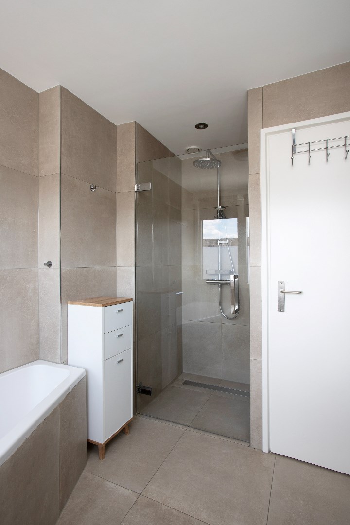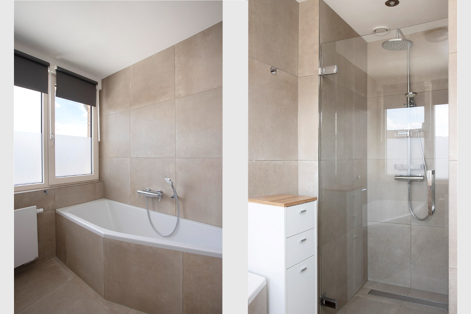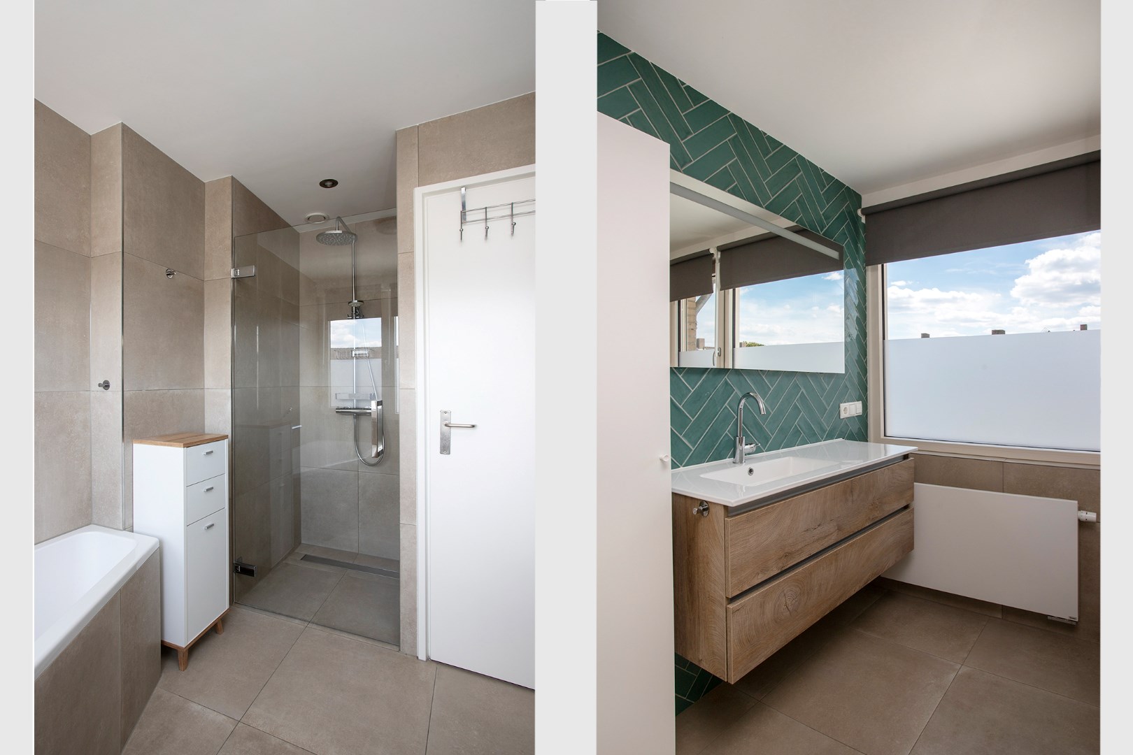 Luxe en modern betegelde badkamer met ligbad, ruime inloopdouche, badmeubel, afzuiging en kunststof draai-/kiepraam met hor en elektrisch zonnescherm.