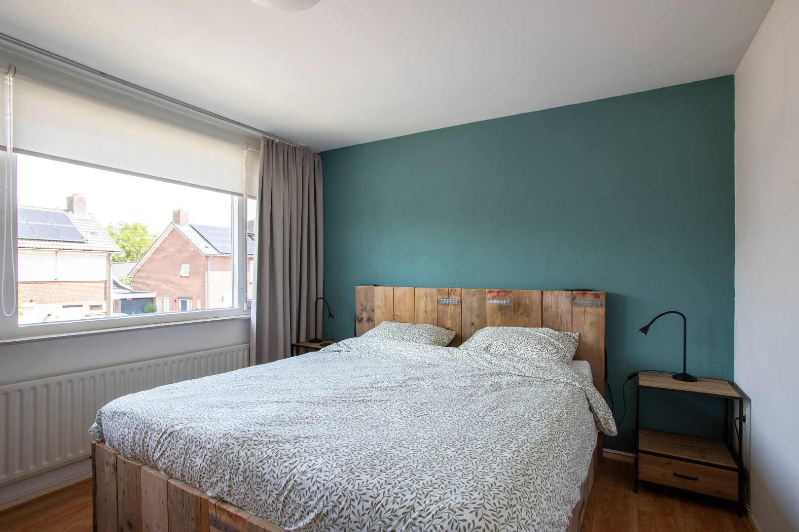 Royale slaapkamer met laminaatvloer, kunststof draai-/kiepramen met hor, stucplafond met inbouwspots en een elektrisch zonnescreen.
