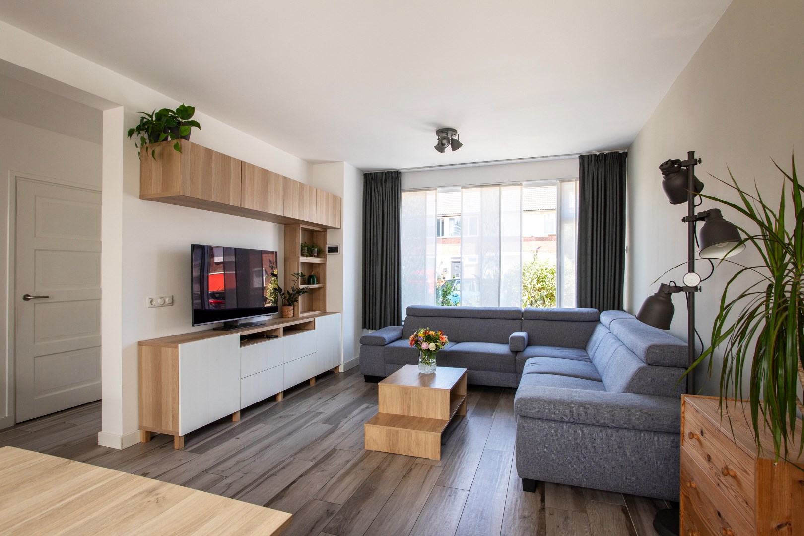 De gezellige woonkamer is voorzien van een houtlook tegelvloer, strak stucwerk plafond en grote raampartijen die zorgen voor veel natuurlijk licht. De houten kozijnen geven de ruimte een warme uitstraling.